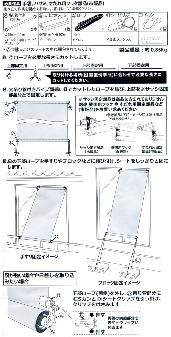 | 内容量 | シート1枚、吊り管付パイプ2本、固定ロープ1本、シートクリップ2個 |