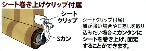 ●シート巻き上げの付属クリップで、風が強い場合や日差しを取り込みたい場合にカンタンにシートを巻き上げ、固定することができます。