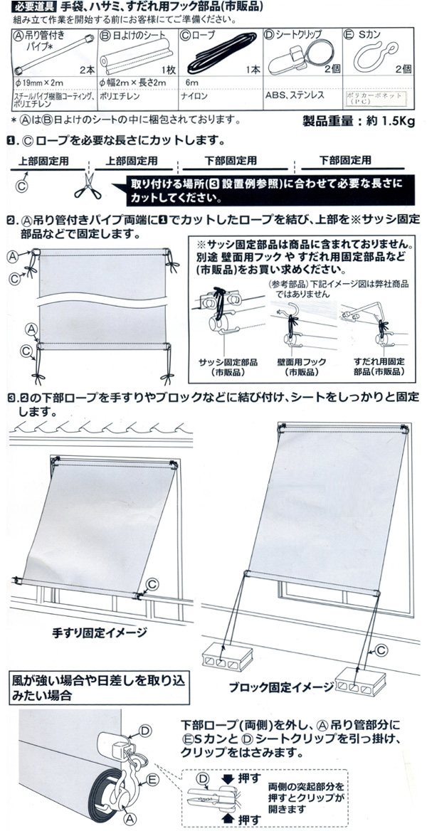 | 材質 | シート:ポリエチレン 吊り管付パイプ:スチールパイプ樹脂コーティング、ポリエチレン 固定ロープ:ナイロン シートクリップ:ABS、ステンレス Sカン:ポリカーボネット |