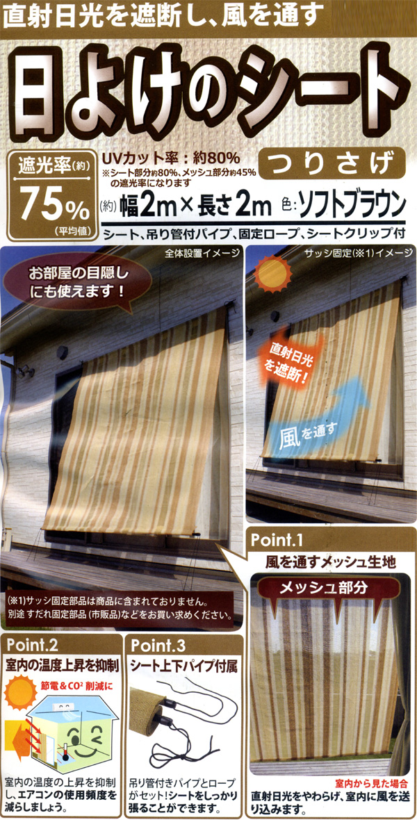 ●遮光率約75%(平均値)。UVカット率約80%(※シート部分が約80%、メッシュ部分約45%の遮光率になります。)