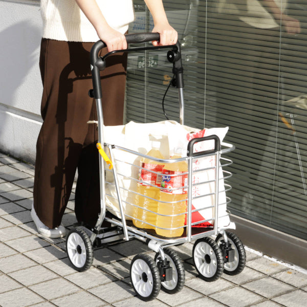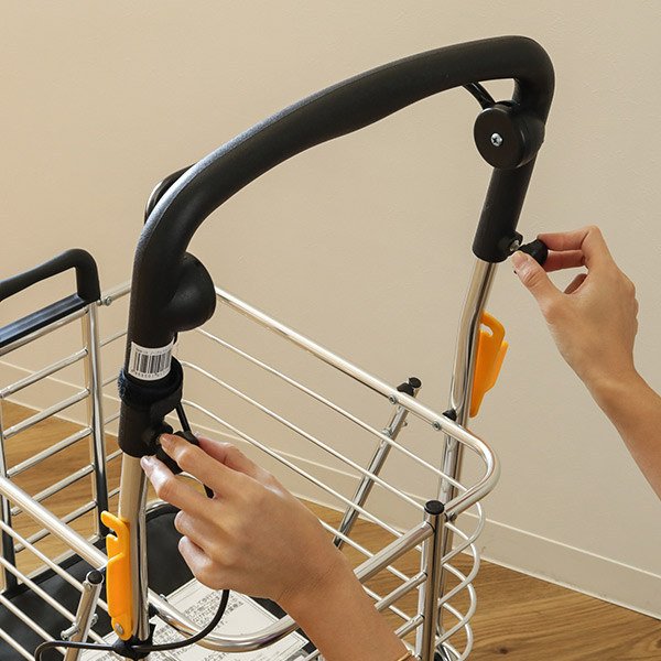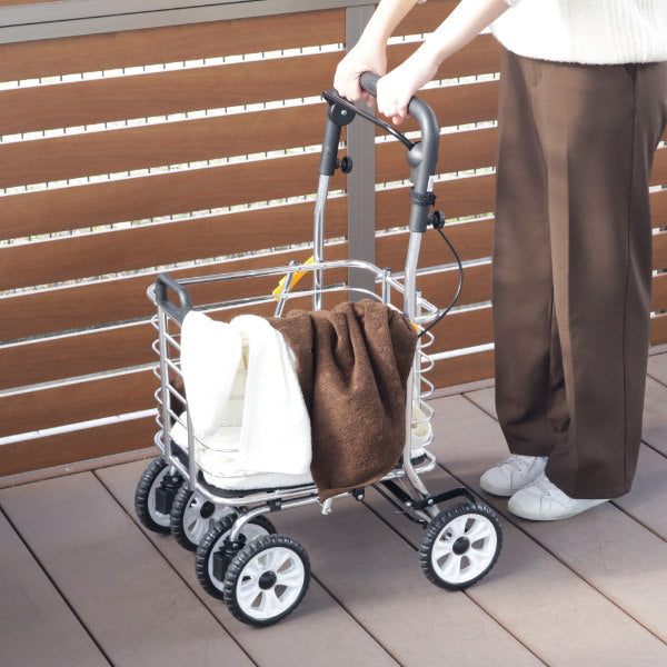自立歩行が可能な方を対象とした歩行補助用具のシルバーカーです。より安定して歩行が出来るよう補助的にお使いいただけます。アルミフレームで構成された、丈夫なカゴ状の荷物入れです。また、万が一汚れてしまっても拭き取ればきれいになるのでお手入れも簡単です。