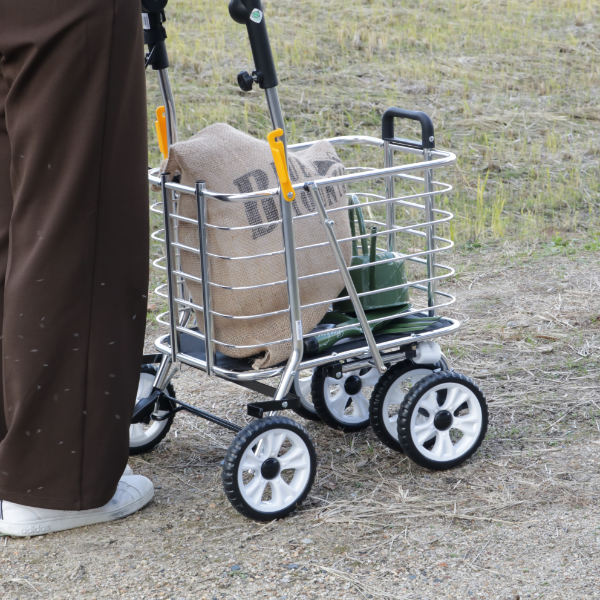 4輪タイプなので安定感があり、前輪はタイヤが2重になっているので凸凹道や段差でも移動が楽々行えます。家庭菜園やガーデニング、お散歩にもおすすめです。