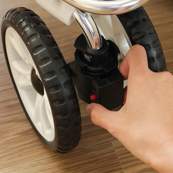 前輪のキャスターは、固定90度、360度の3段階に切り替え可能です。路面の状態に合わせて使い分けることでスムーズに移動ができます。