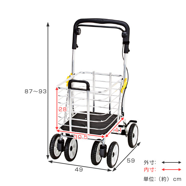 | サイズ | 約 幅49×奥行53×高さ87~93(cm) 折りたたみ時:約 幅49×奥行31×高さ88(cm) カゴ:約 幅30.5×奥行41×高さ28(cm)・耐荷重:20kg バッグ:約 幅30×奥行42×高さ30(cm) 車輪:6.5インチ |