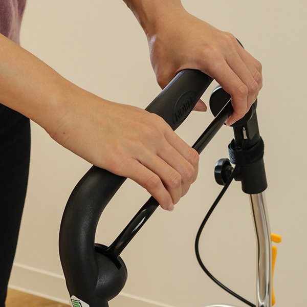 ハンドブレーキと駐車ブレーキがついています。坂道でスピードを落としたい時など、手元にあるブレーキを引くとブレーキがかかります。駐車ブレーキは足元のロックを踏むと後輪が固定されるので安心してカートから離れることができます。