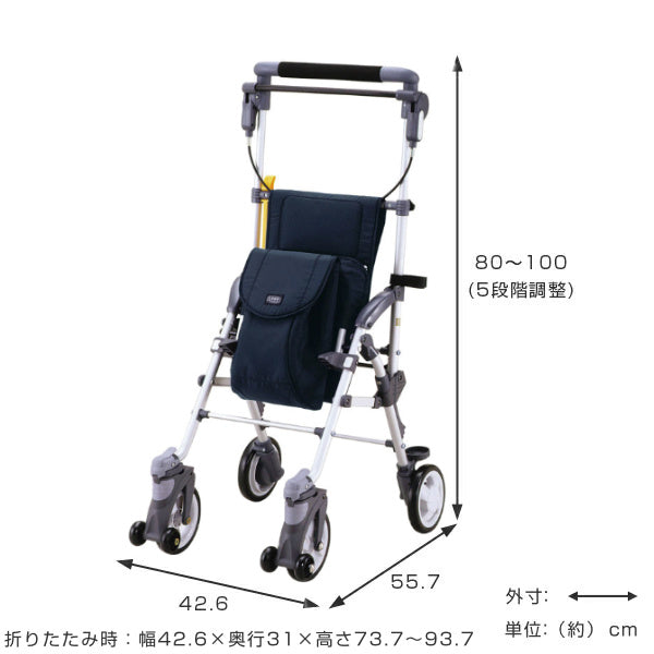 | サイズ | 約 幅42.6(42.6)×奥行55.7(31)×高さ80~100(73.7~93.7)(cm)※()は折りたたみ時 ハンドルの高さ:80・85・90・95・100cm※5段階調節 フロントバッグ:約 幅15×奥行12×高さ28(cm)容量:4L 小物ポケット:約 幅23×奥行4×高さ20(cm)容量:1L 車輪:約直径13.8cm |