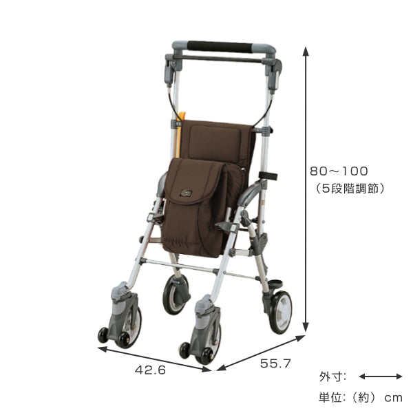 自立歩行が可能な方を対象とした歩行補助用具です。より安定して歩行が出来るよう補助的にお使いいただけます。お散歩やお買い物にも便利なバッグ・小物入れや、休息に用いる座面など利用者のことを考えたさまざまな機能が、生活を快適にしてくれます。