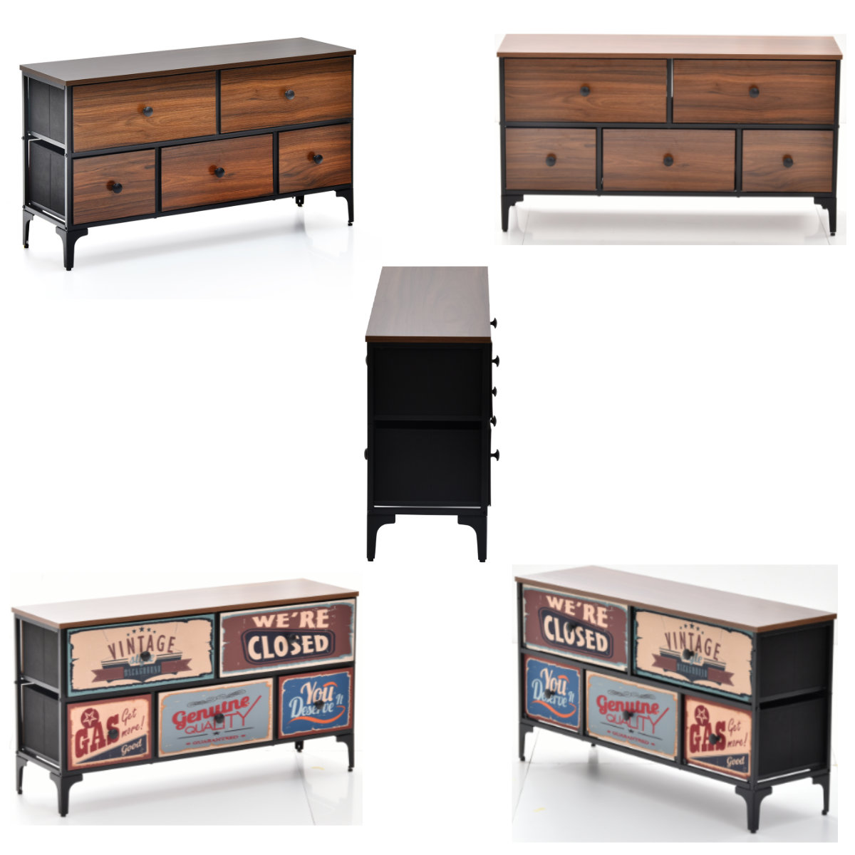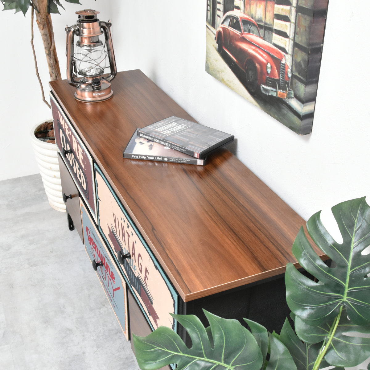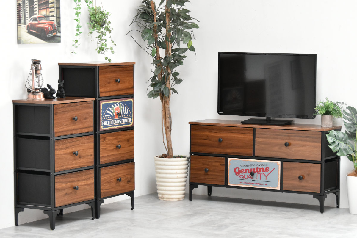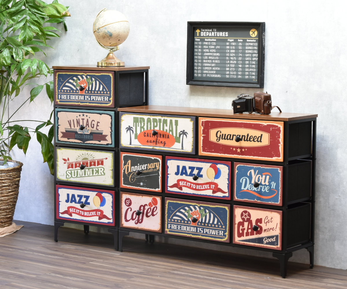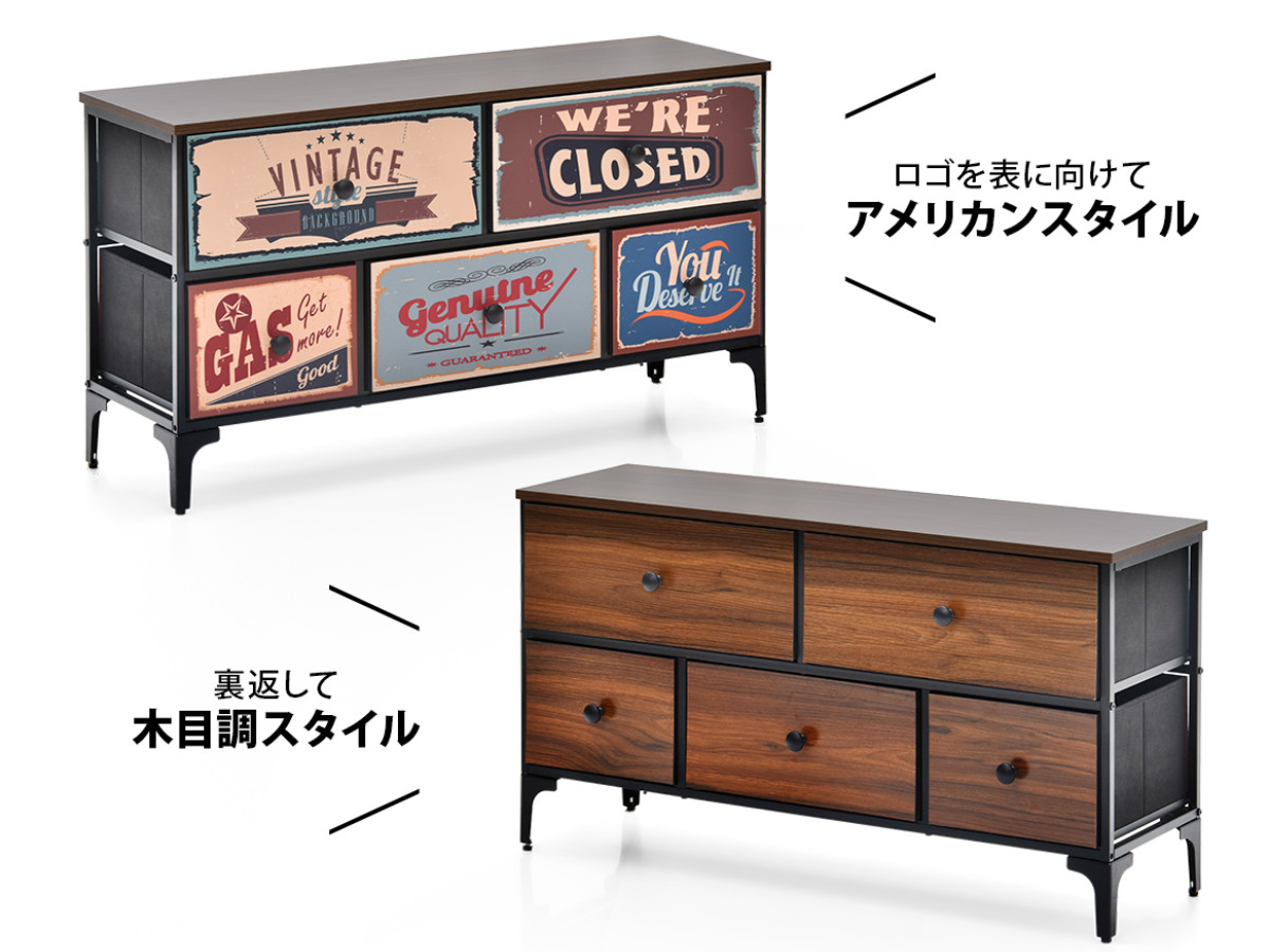 レトロなロゴをあしらった遊び心あるデザインと、リアルな木の手触りを感じるウッド調のフロントパネル。気分やお部屋の雰囲気に合わせて前板を裏返すだけで、ガラッと印象をチェンジできるチェストです。