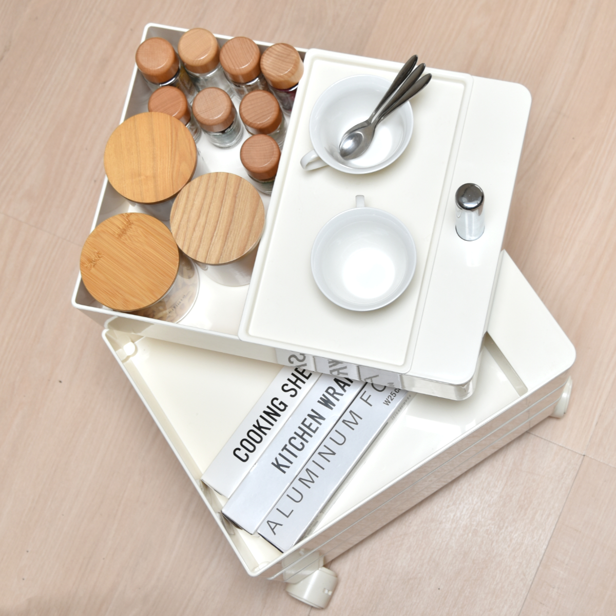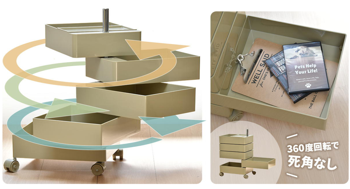 ワゴンをくるっと回すだけで、引き出しの中身がすぐに確認できる「360度回転式ワゴン」。収納物の出し入れもスムーズで、整理整頓が苦手な方でもラクに整理できます。毎日の生活をちょっと快適にしてくれる、頼れる収納アイテムです。