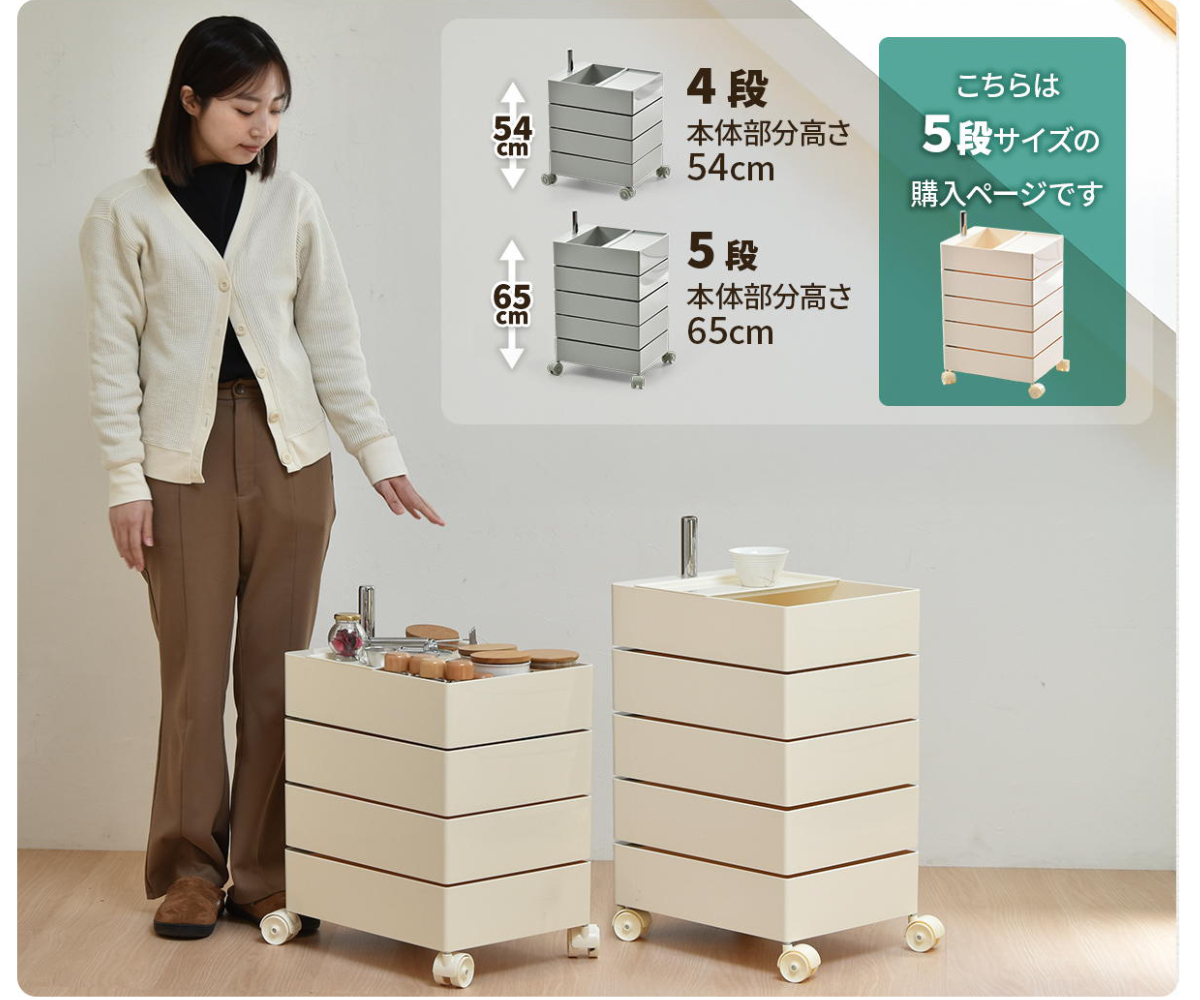 段数は、使うシーンに合わせて選べる、4段タイプと5段タイプから選べます。4段タイプはデスク横やリビングのサイドワゴンに、5段タイプは収納量を確保したい方やファミリー使いにおすすめです。