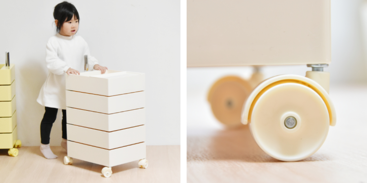 ワゴン上部にはスチール製の持ち手が付いています。四輪キャスターもスムーズに動くので、お部屋の模様替えや、お掃除のときも必要な場所へ移動できます。お子さまでも簡単に扱えます。