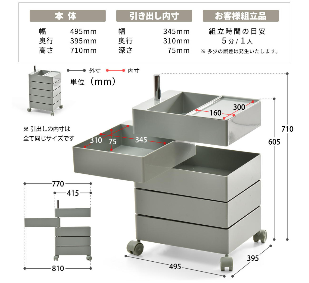 ワゴンは面倒な組み立ての必要がない本体完成品です。4輪キャスターを底部に取り付けるだけなので、届いたその日からお使いいただけます。