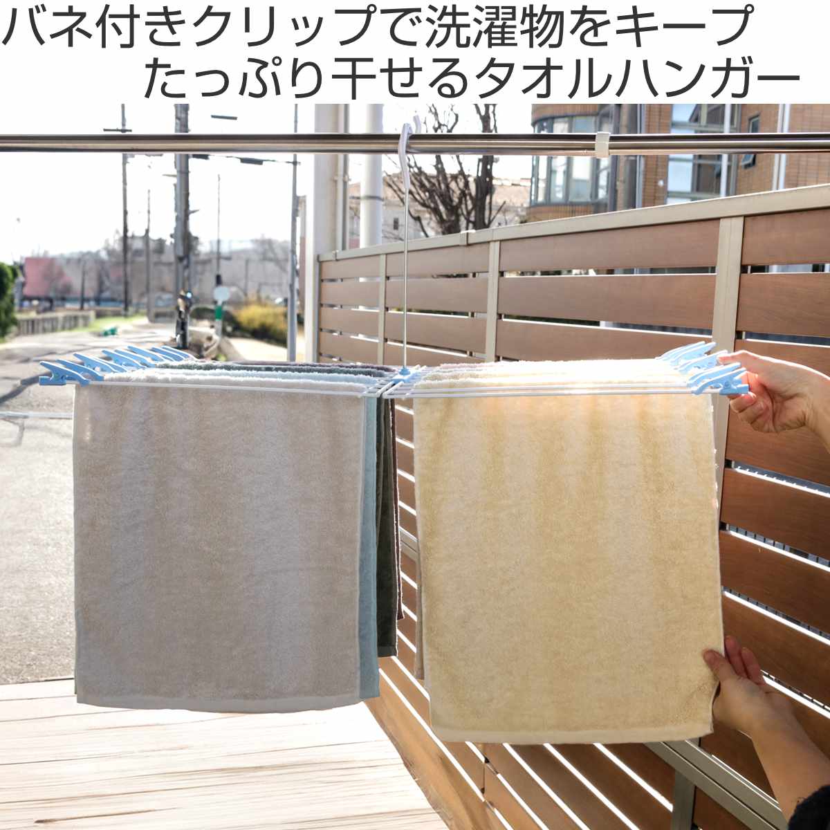 20本のアームでタオルや下着、布おむつなどをたっぷり干せるタオルハンガーです。アームの先端にはバネ付きクリップが付いているので、洗濯物をしっかりとめることができ、外干しの際も安心です。