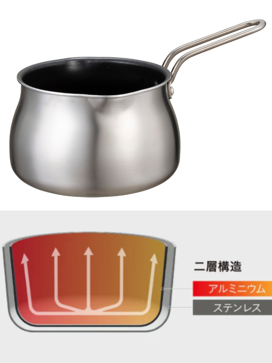 熱伝導性の高いアルミニウムと、保温性に優れたステンレス鋼を組み合わせた二層構造のミルクパンです。アルミが熱をすばやく全体に伝え、ムラなく加熱します。ステンレス層は熱をしっかりキープし、調理後も料理が冷めにくいです。