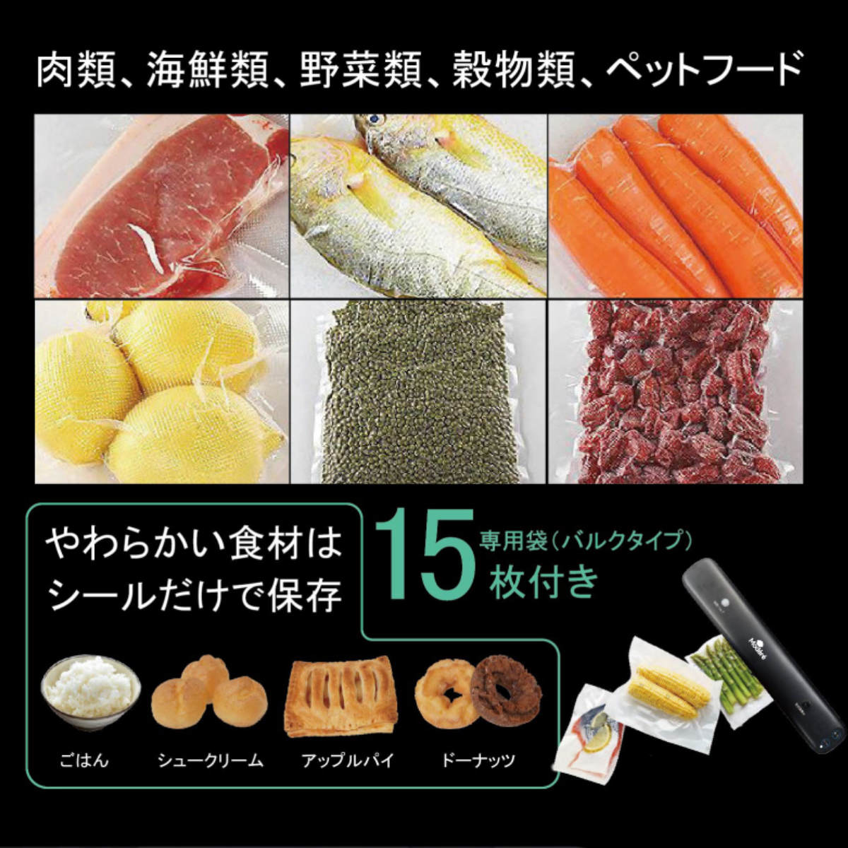 肉類・海鮮類・野菜類・ペットフードなど、さまざまな食材を真空保存できます。やわらかい食材は吸引せず、シールのみで保存可能です。専用の袋が15枚付属しているので、届いたその日からすぐにお使いいただけます。