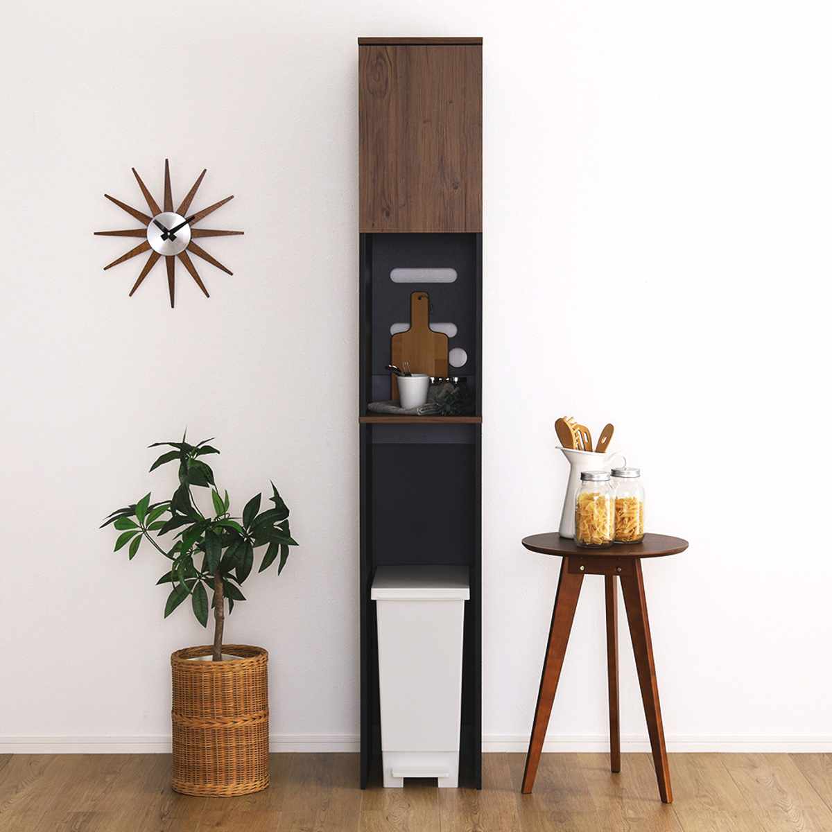 中途半端なデッドスペースを埋めてくれるスリムなゴミ箱上ラックです。上部は扉収納とオープン収納がある為、食器や家電などをスマートに収納できます。お部屋の雰囲気に合わせて、シャビーオーク、ウォールナット、ホワイトオークの3色からお選びいただけます。
