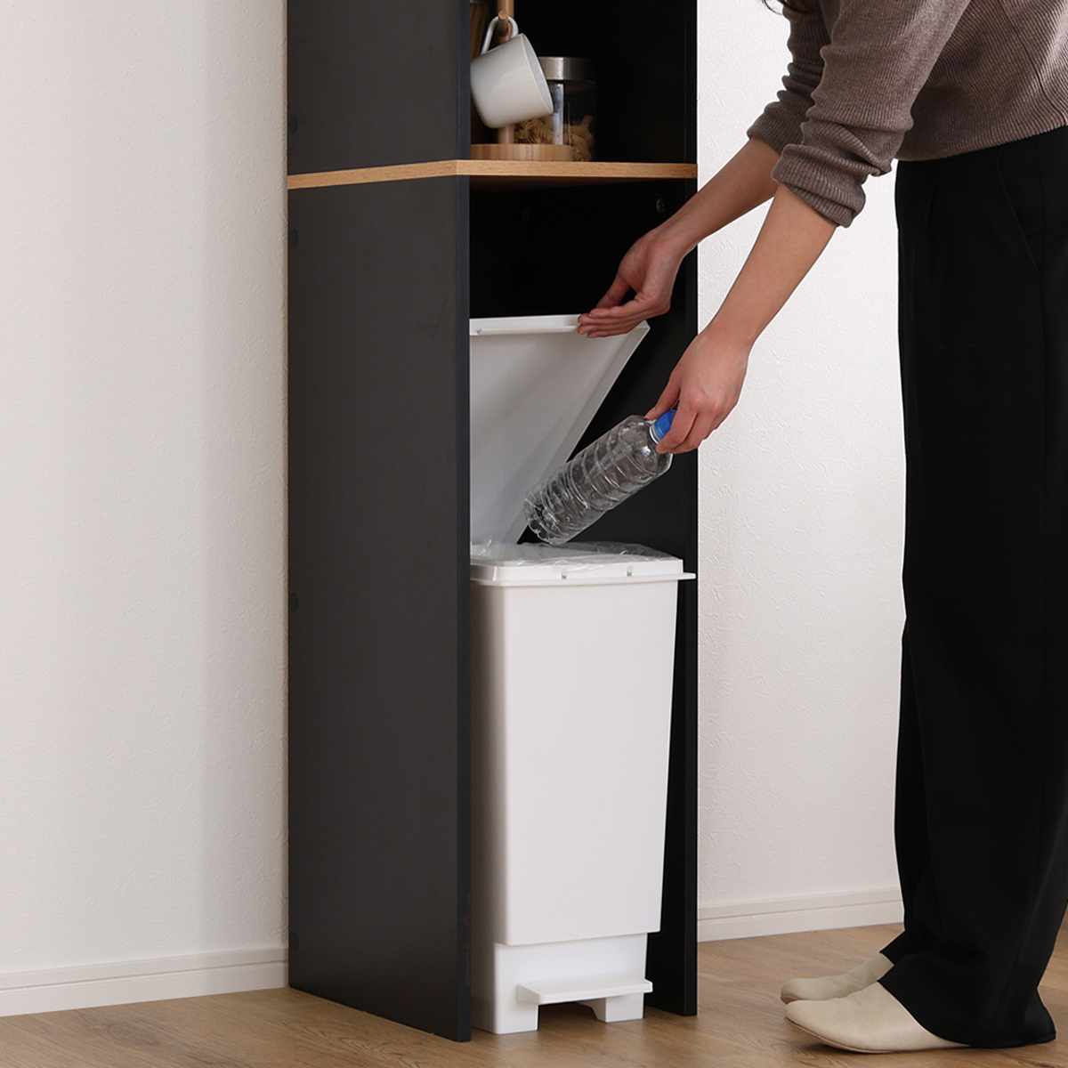 一般的な30Lスリムタイプのゴミ箱が1つ収まります。収納スペースは約88.5cmと高めに設計されているため、 蓋つきのゴミ箱でも快適にご使用いただけます。