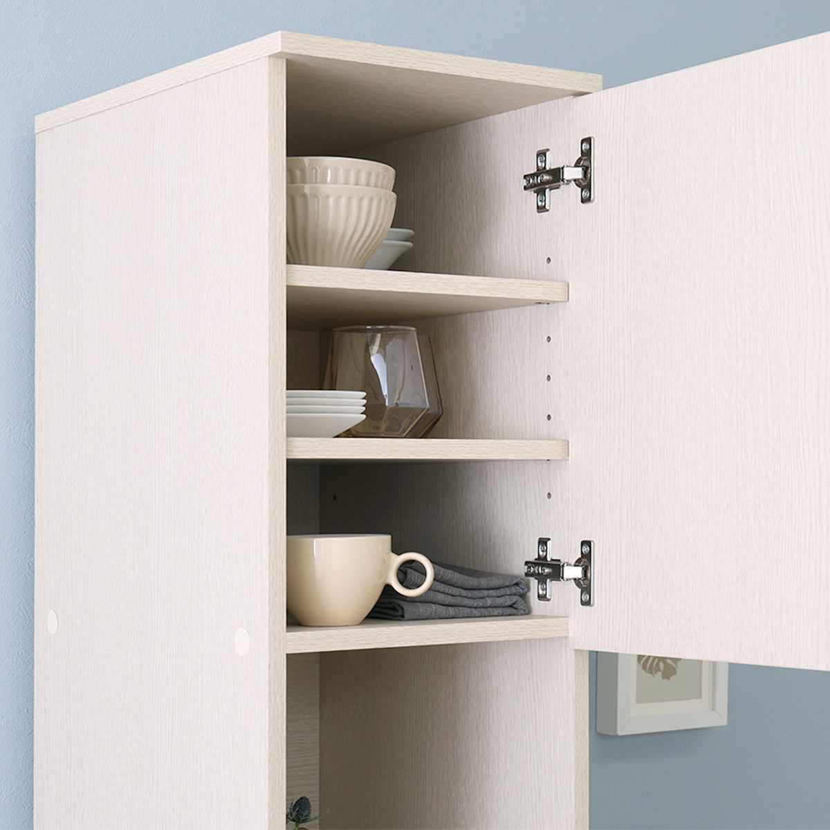 食器や調理器具も収納できる扉収納。棚板は可動式なので、収納したい物に合わせて高さを調節できます。