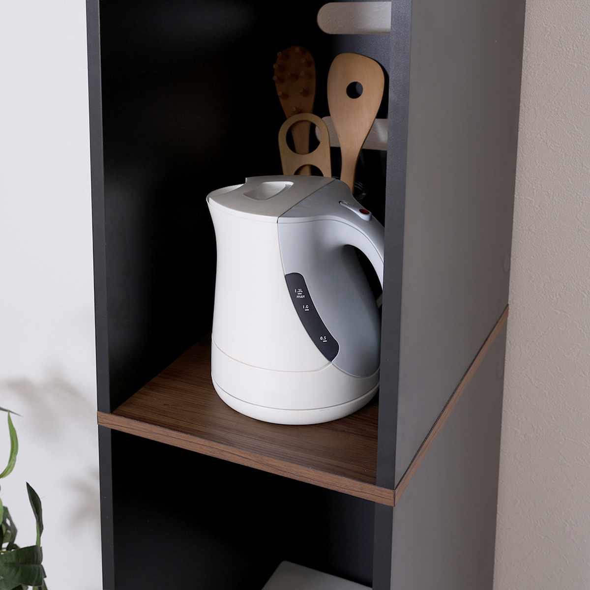 手が届きやすい高さのオープン収納は、 キッチンツールなどすぐに使う物の収納に役立ちます。コンセントやコード穴があるので電気ケトルなどの置き場にも最適です。