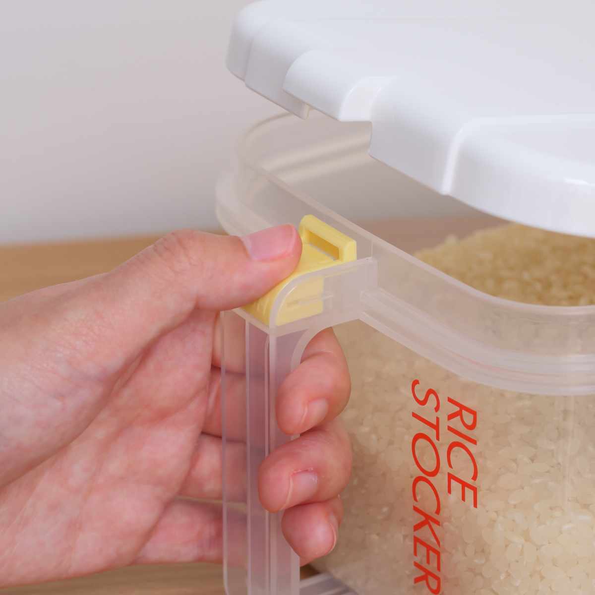 取っ手のボタンを押すだけでフタが開くワンプッシュ式です。片手で簡単に開けられ、お米をスムーズに取り出せます。
