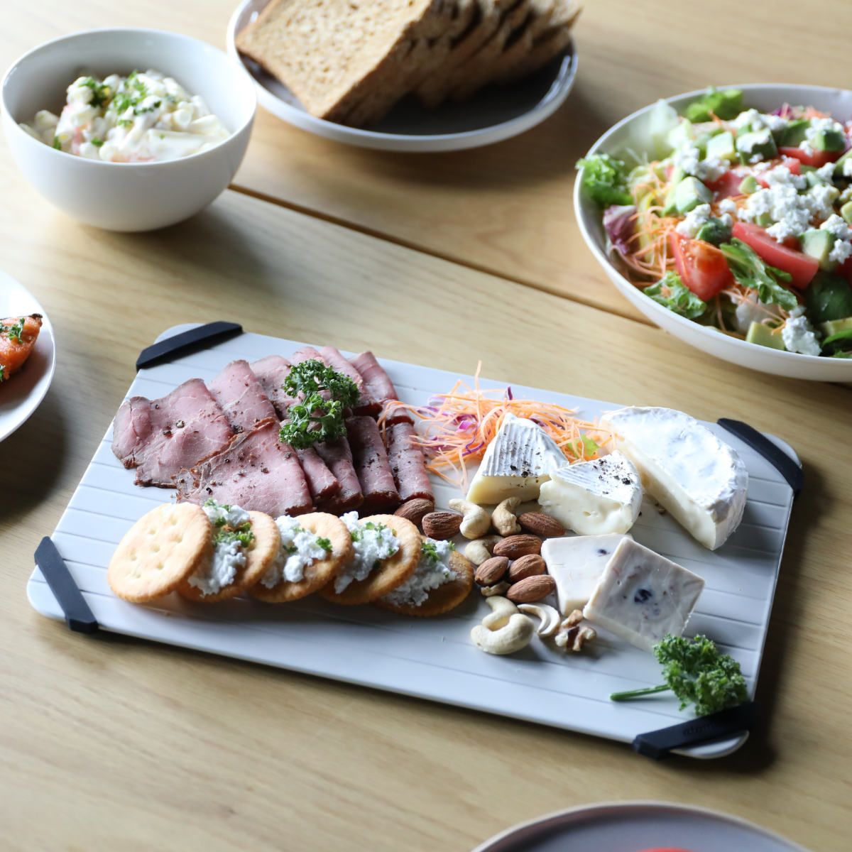 おつまみ類の盛り付けにも使いやすく、サービングプレートとして食卓でも活躍します。バンドをしていることでプレートとテーブルの間に隙間ができ、プレートを持ち上げやすいです。またバンドはシリコーンゴム製なので、すべり止めにもなります。