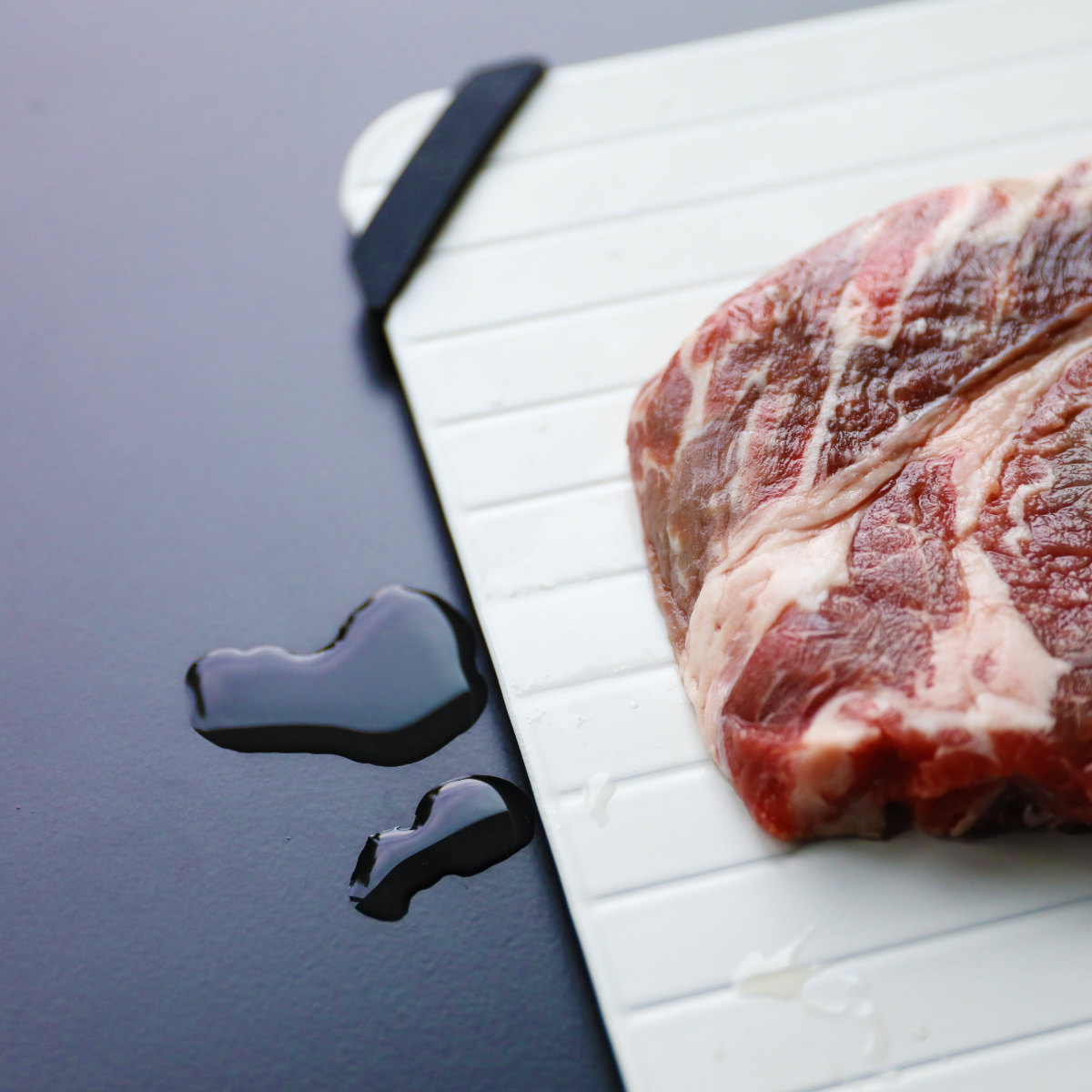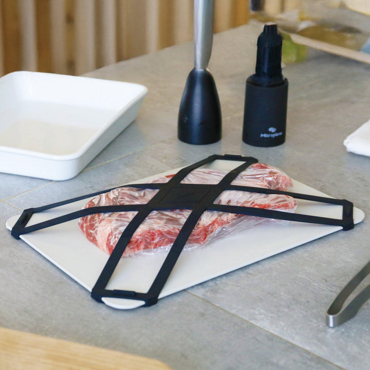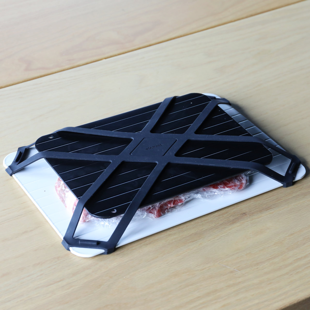 置くだけで食材を急速解凍してくれる、アルミ製の解凍プレートです。電子レンジを使わず、解凍ムラ解消&経済的。またこちらはバンド付きとなっており、食材を抑えてプレートとしっかり密着させることで、さらに素早い解凍が期待できます。