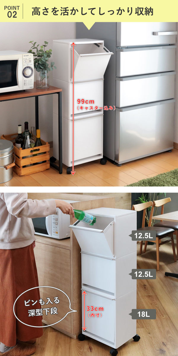 高さ99cmの縦型3段ゴミ箱は、スリムながら高さを活かしてたっぷり収納できます。上段・中段はそれぞれ12.5L、下段は18Lで、合計43Lの容量を確保。深さのある下段には、ワインボトルや背の高いペットボトルもスッキリ収まります。