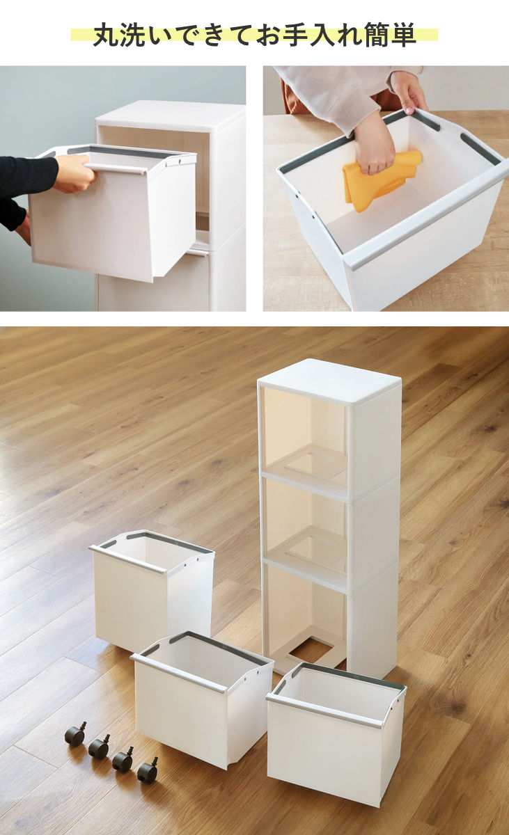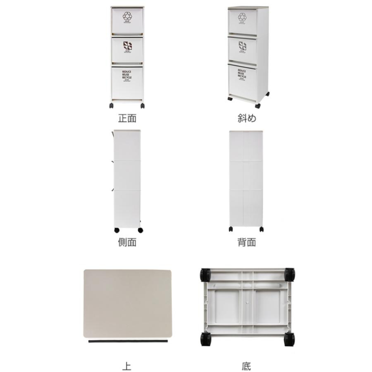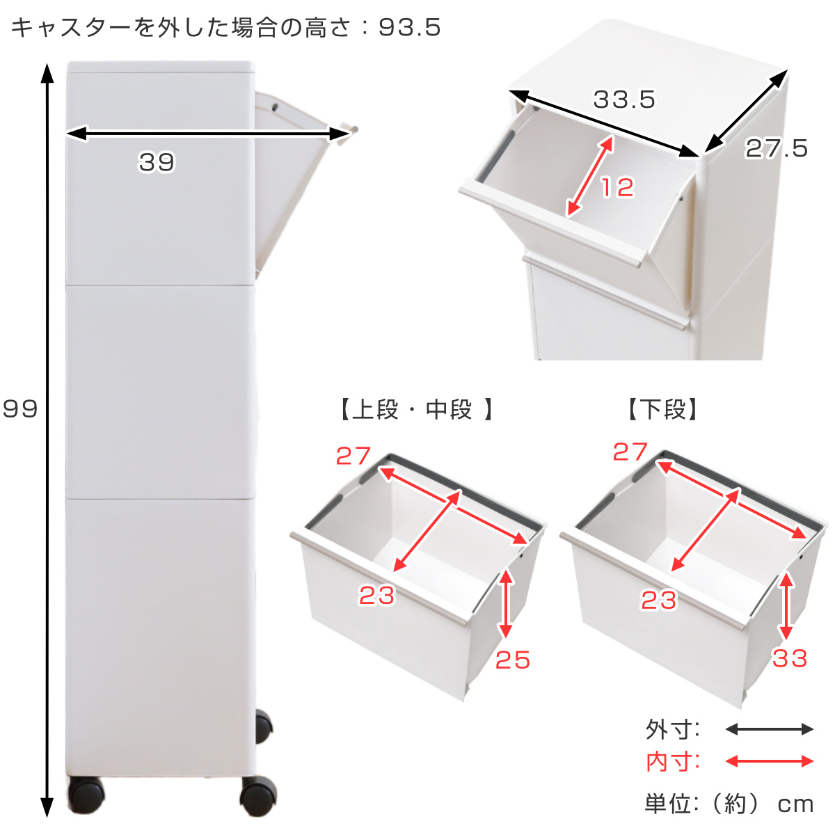 | 備考 | ※適応袋サイズ:【上段・中段】20L(約 幅52×高さ60cm) 【下段】45L(約 幅65×高さ80cm) ※キャスターは取り外し可能、ストッパーは付いていません。 |