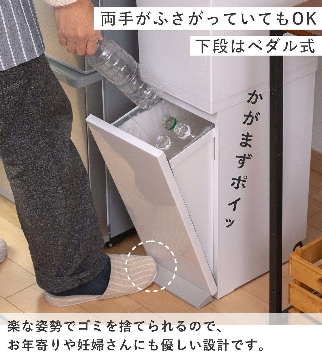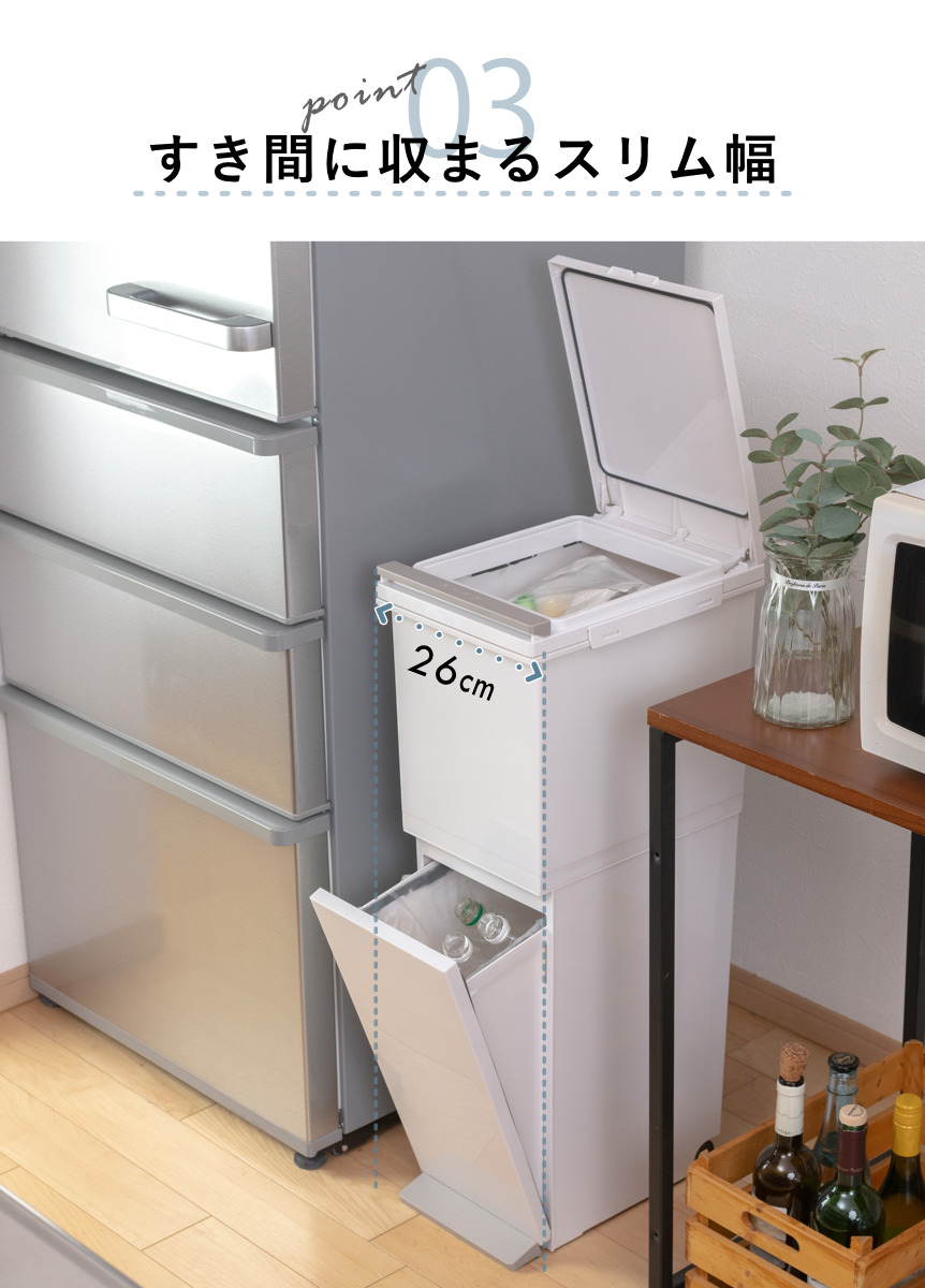 冷蔵庫・シンク・食器棚横などキッチンの狭い空間にも無理なく収まるスリム設計。すき間を有効活用でき、省スペースで分別を叶えます。