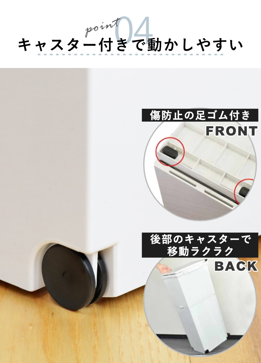 後ろには2つのキャスター付きで、掃除機をかける時などちょっとした移動にも便利です。袋の交換もスムーズに行えて、毎日のちょっとした手間がぐんと快適に。