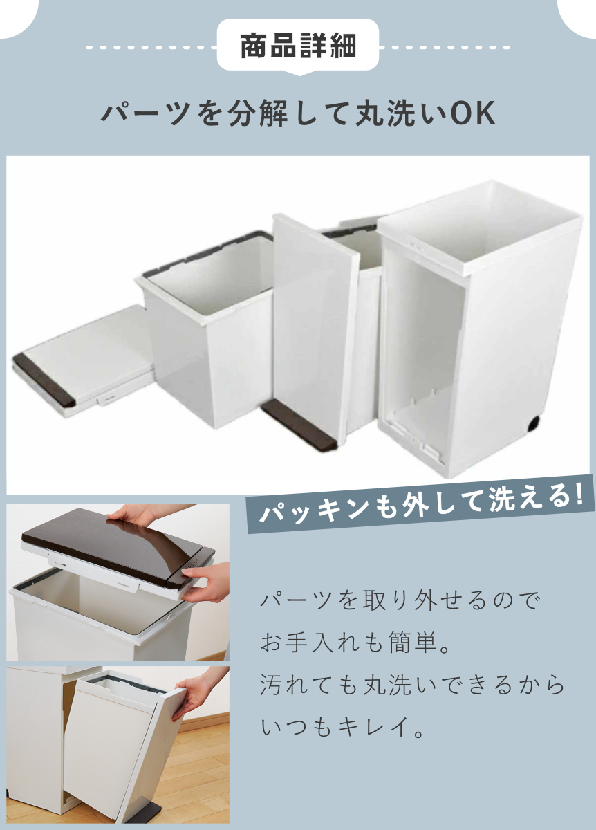 | 材質 | フタ・上下本体・フレーム・袋止め・キャスター:ポリプロピレン ペダル・プッシュレバー:ポリスチレン 下本体パッキン・滑り止め:ポリエチレン フタパッキン:シリコーンゴム バネ:ステンレス鋼 |