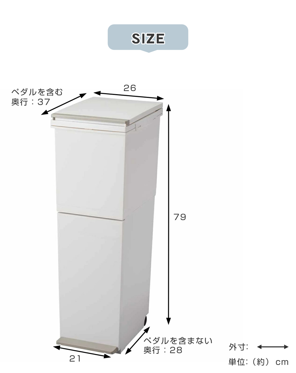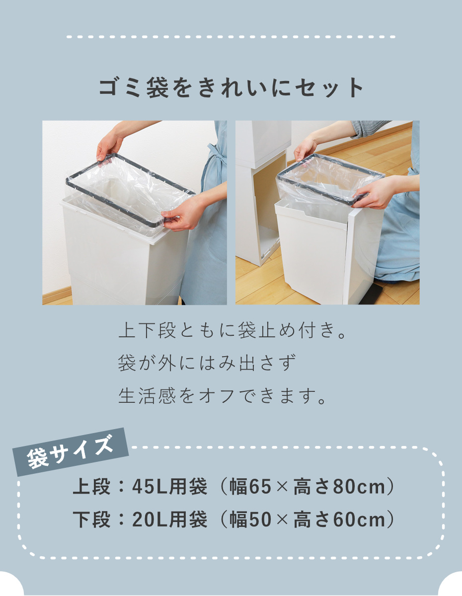 | 対応サイズ | ※推奨ポリ袋サイズ 【上段】市販45L用ポリ袋:幅65×高さ80(cm) 【下段】市販20L用ポリ袋:幅50×高さ60(cm) ※上段・下段で袋止めのサイズが異なります。 |