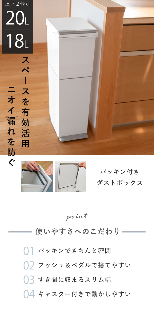 密閉性を高めるため、上下段ともにパッキンを採用。生ゴミ、オムツ、ペットシーツ・・・、毎日の暮らしで気になるニオイをしっかりシャットアウトします。ゴミ箱からのニオイ漏れを防ぎ、キッチンやリビングにも快適な空間を保ちます。