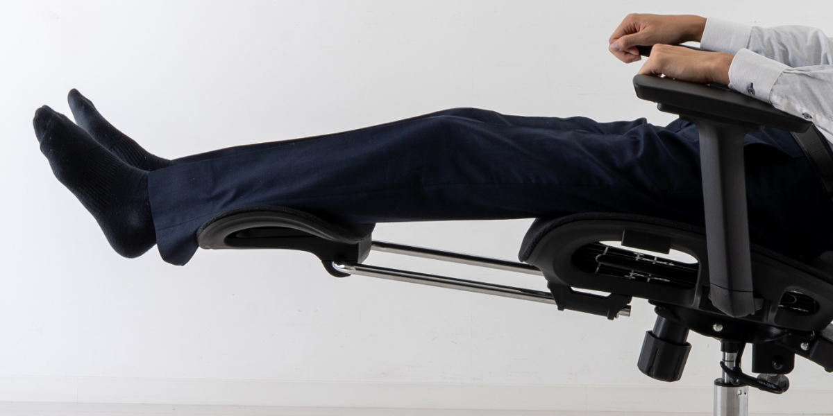 無段階で止められるリクライニング機能付きです。背もたれと座面が連動するシンクロロッキング機構を採用し、体圧を分散しながら体を支えます。さらに、フットレスト付きで脚を伸ばしてリラックスでき、気分転換の時間も快適に過ごせます。