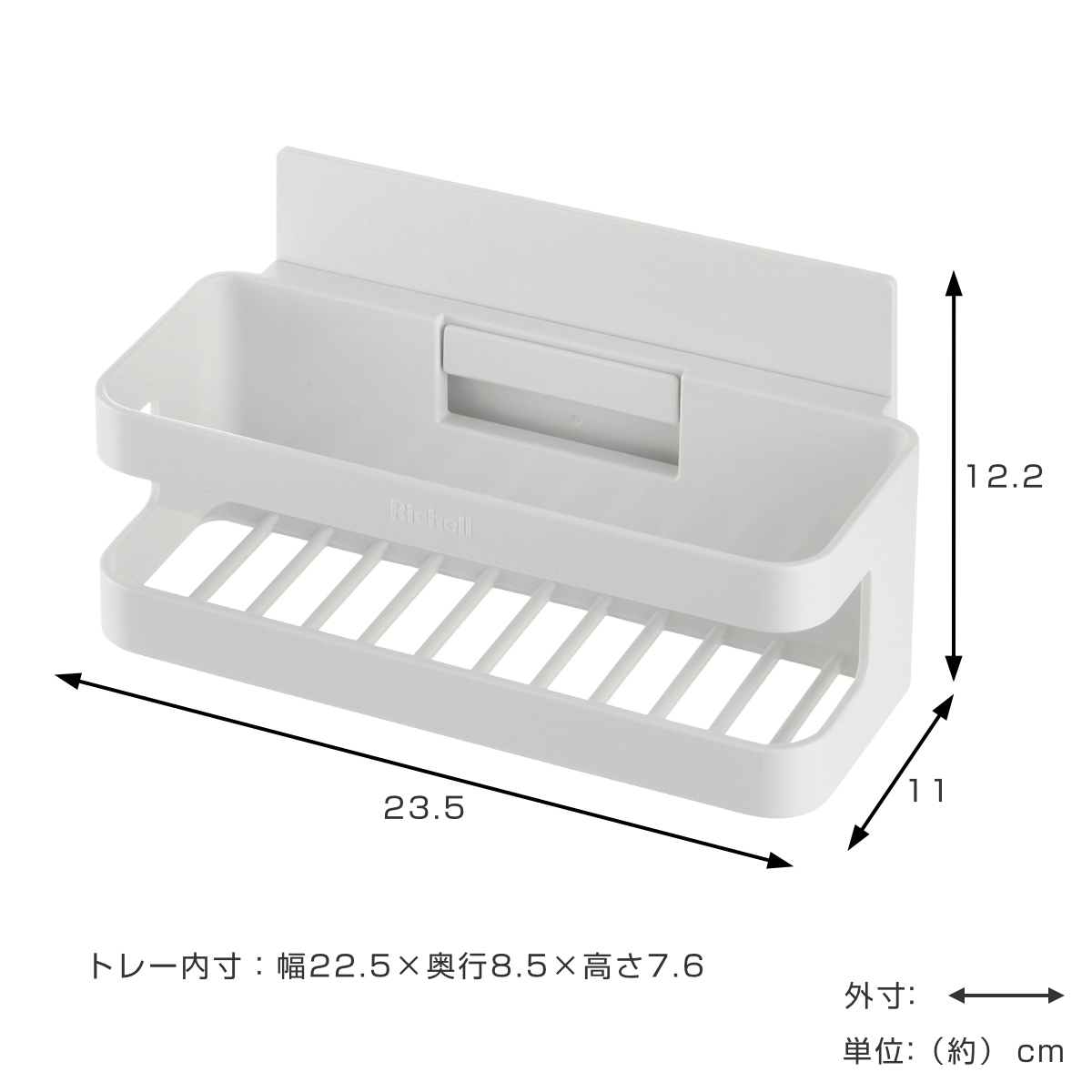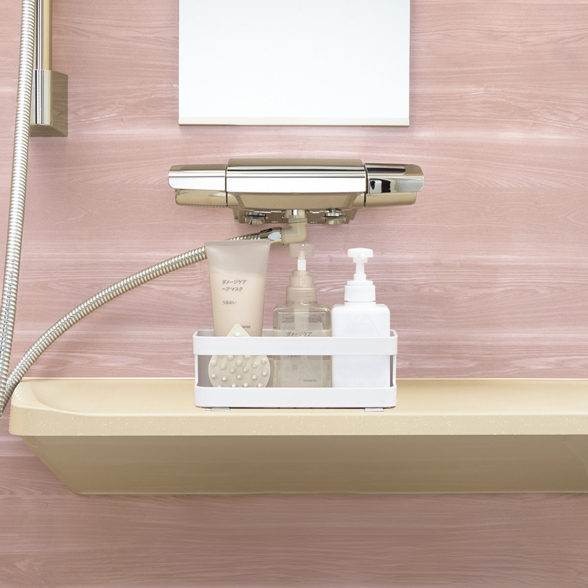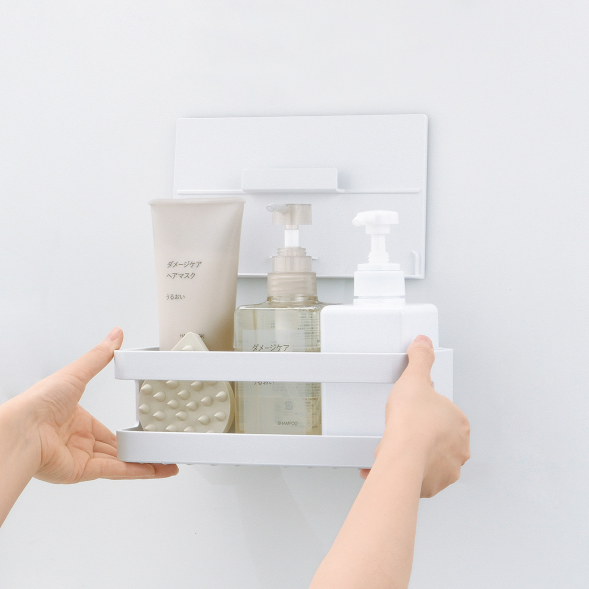 シャワーの飛び散りを避けて壁面に浮かせて収納できるトレーです。トレーが濡れにくく、使用後も乾きやすい状態が続きます。湿気がこもりにくい構造で、カビやヌメリの発生を抑えながら、バスルームを清潔に保ちたい方にぴったりの設計です。