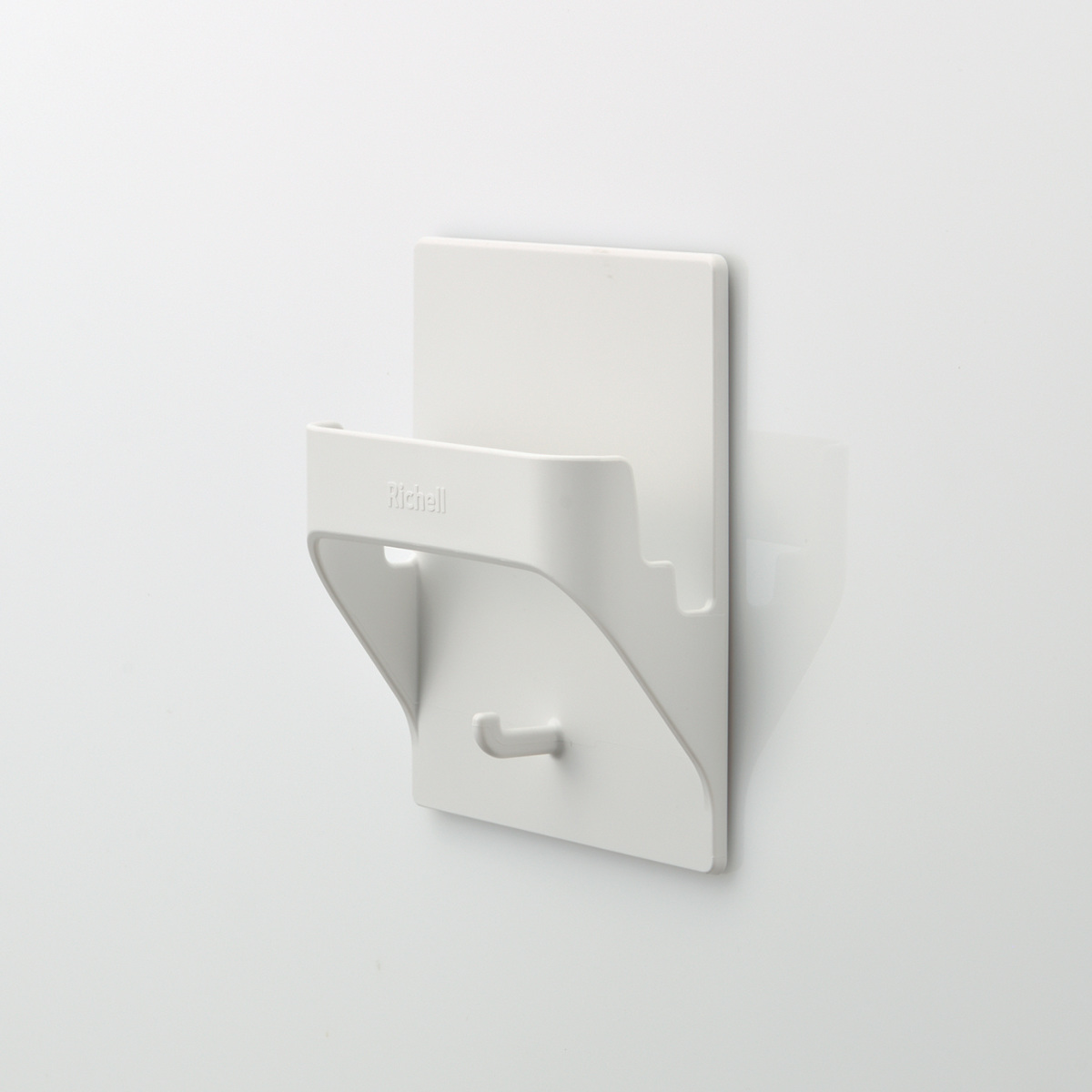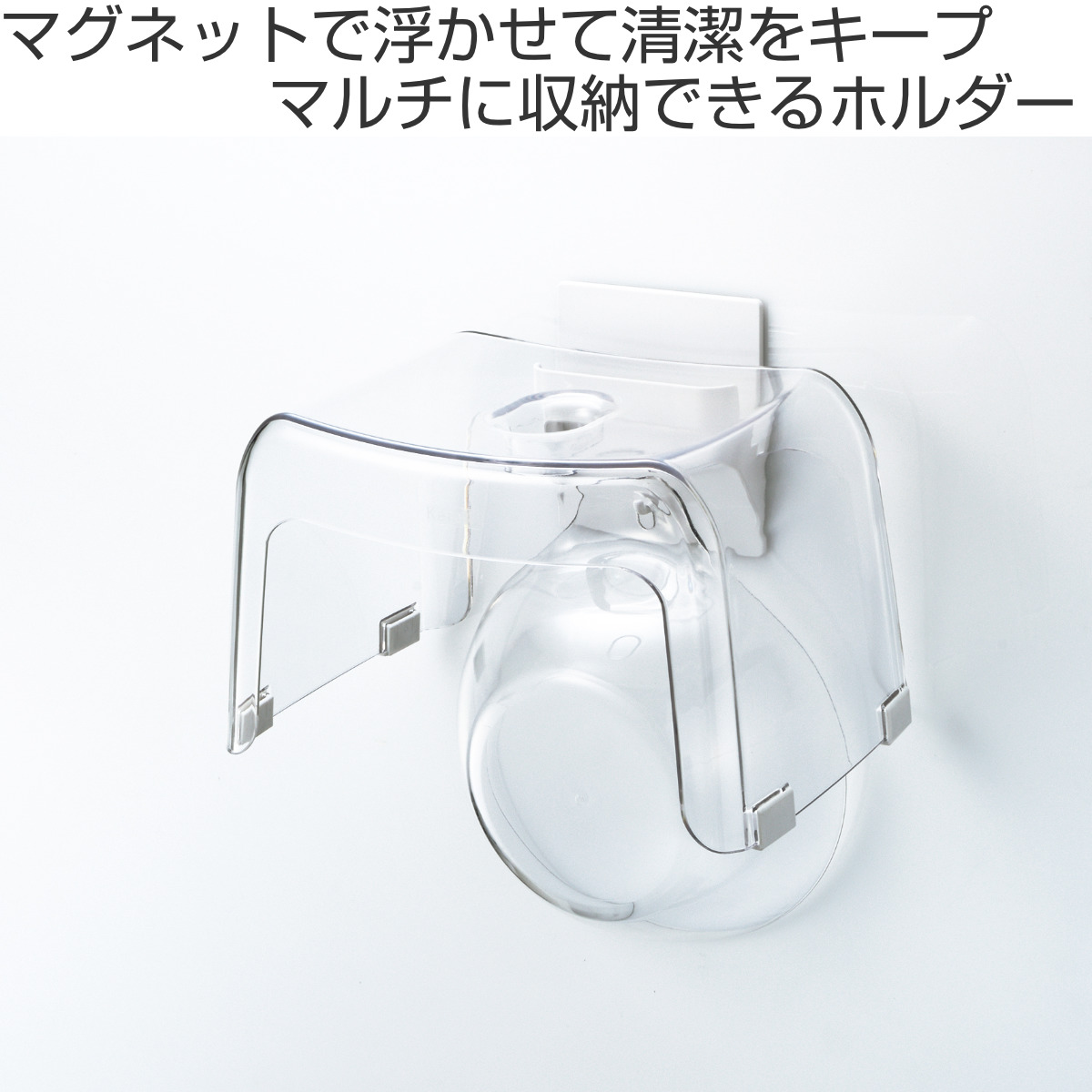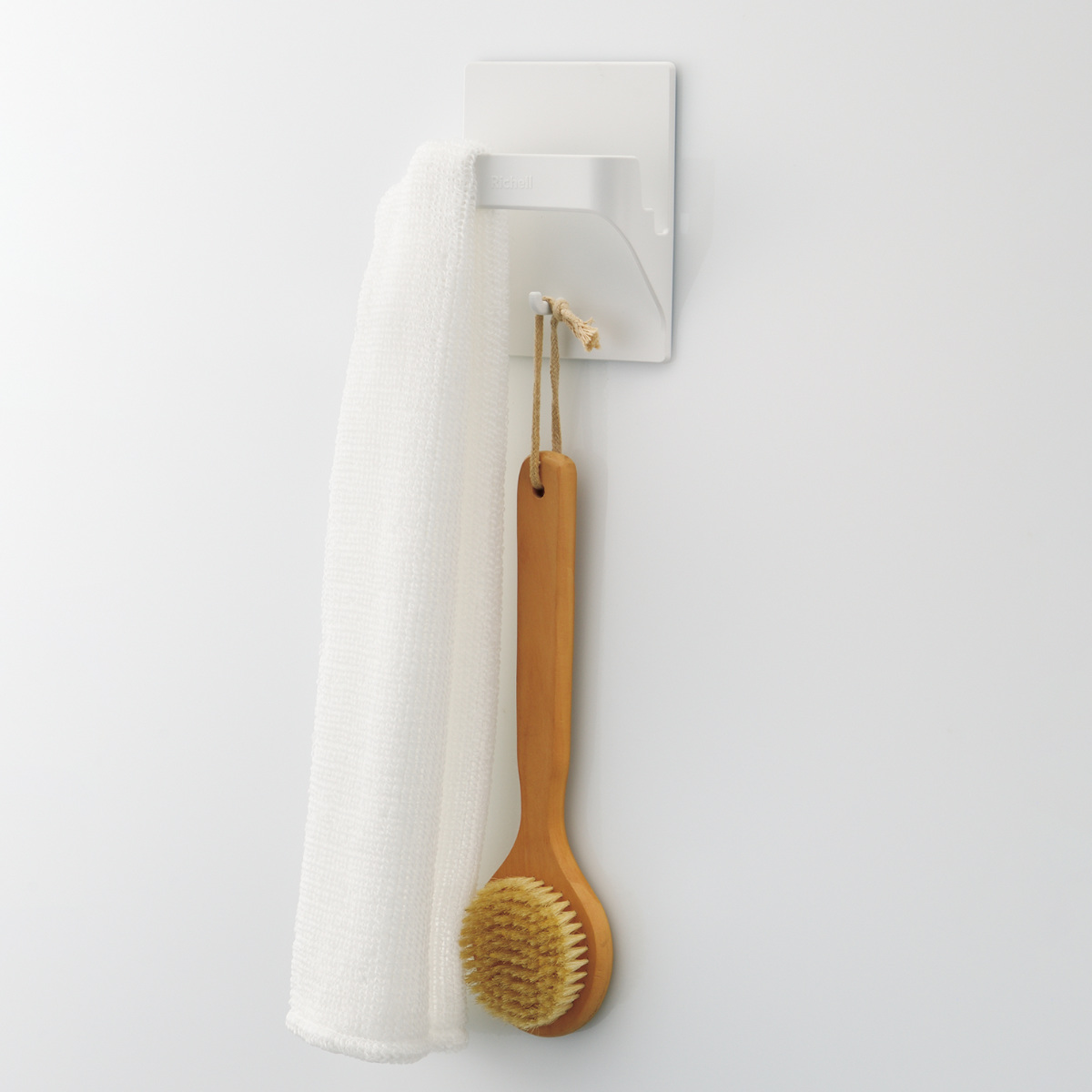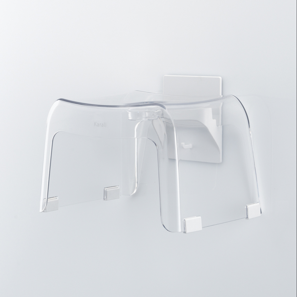 シャワーの飛び散りを避けて壁面に浮かせて収納できるマルチホルダーです。ホルダー部とフック部の両方に収納でき、風呂イスや桶を床に置かずにすっきり整理できます。水切れがよく、ヌメリや汚れを防いで清潔な浴室環境を保てます。