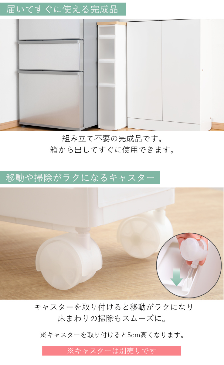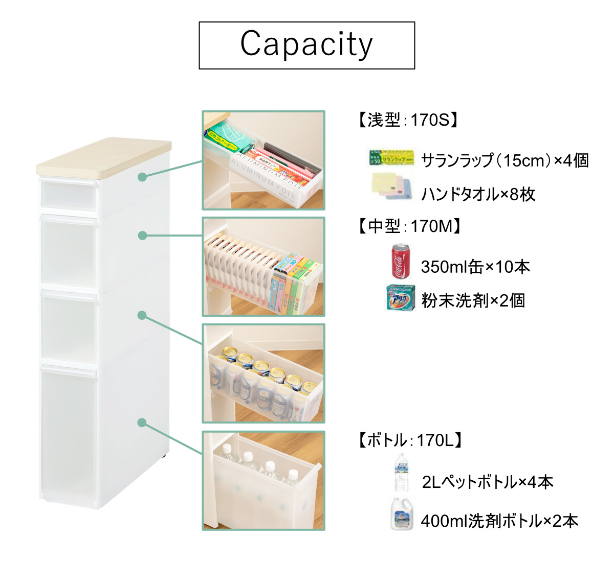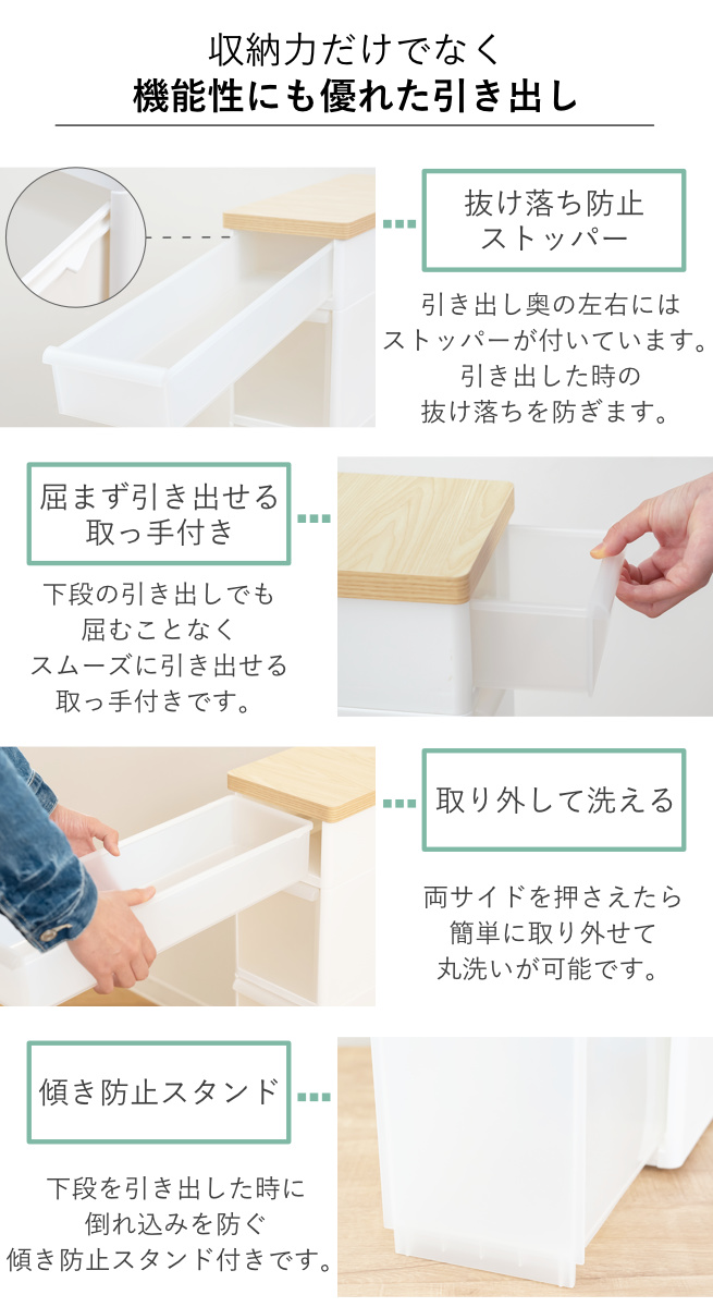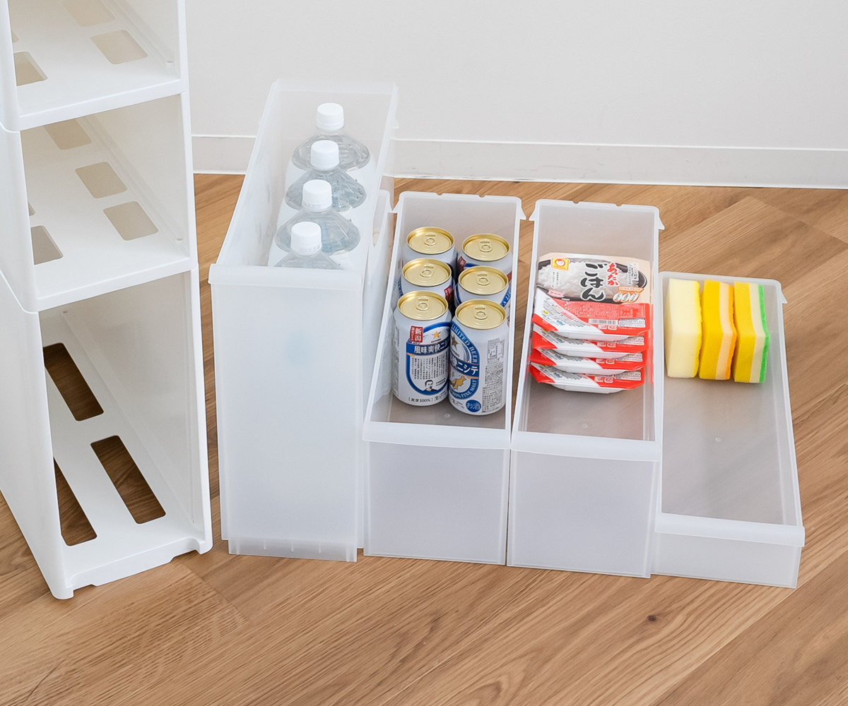 | 引き出し1段あたり耐荷重 | 浅型:約 2.5kg 中型:約 5kg ボトル:約 10kg |