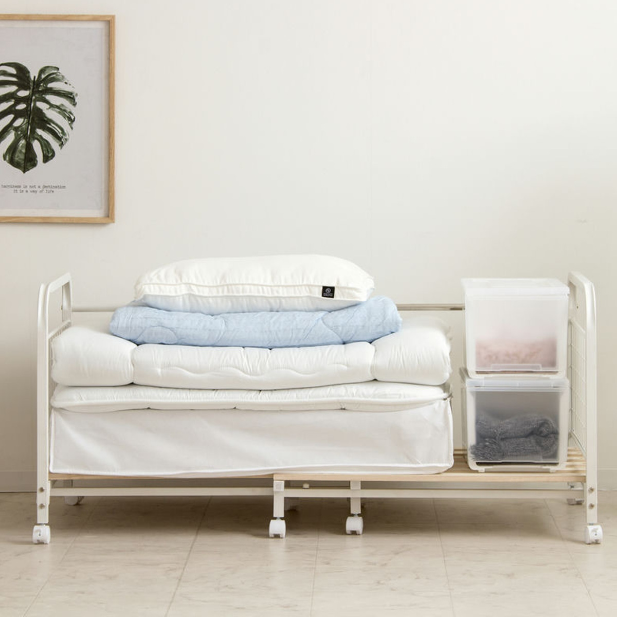 敷布団や掛け布団はもちろん、三つ折りマットレス、毛布、タオルケット、枕などおうちにある寝具類を一台でまるごと収納できます。一般的なシングルサイズに丁度よく、ご家族住まいから収納の少ない一人暮らしのお部屋まで様々な住まいで便利に活躍します。
