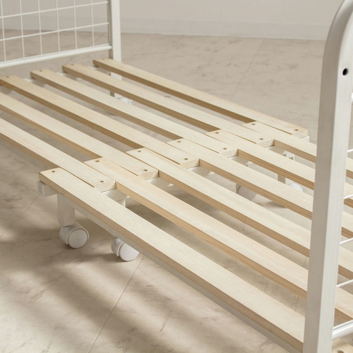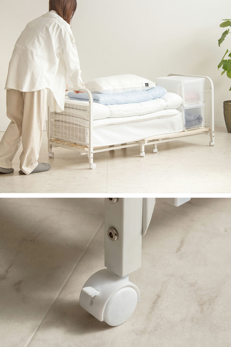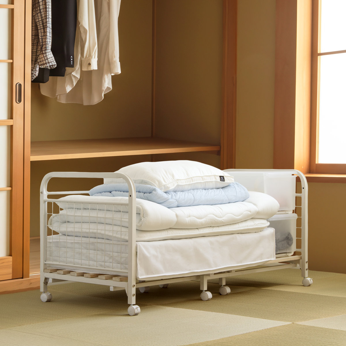 大きな布団もこのキャスター付きのラックに乗せれば、足腰への負担が減りラクに運べます。布団の近くまでラックを移動させ、その場で布団を片付けられます。布団干場や押入れへの移動もしやすく、お掃除も簡単です。