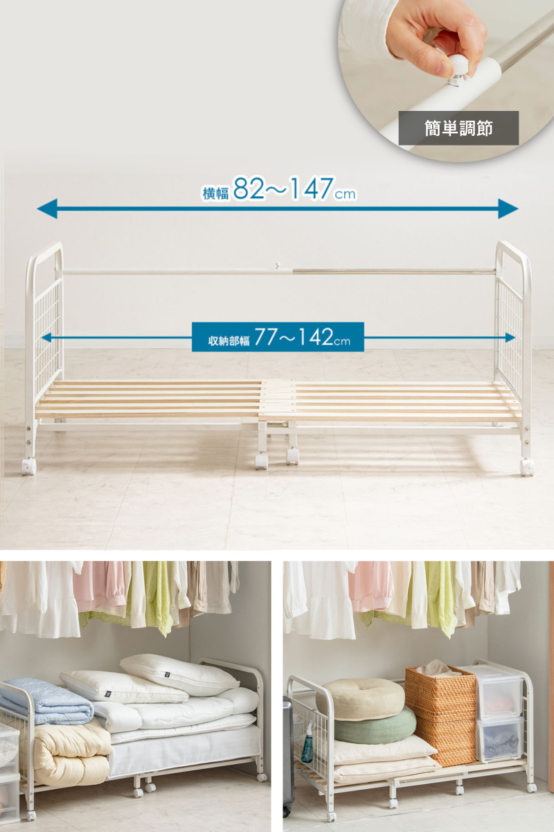 布団収納ラック 伸縮式 1段 奥行深型 幅82-147cm 奥行68cm 床板すのこ キャスター付き