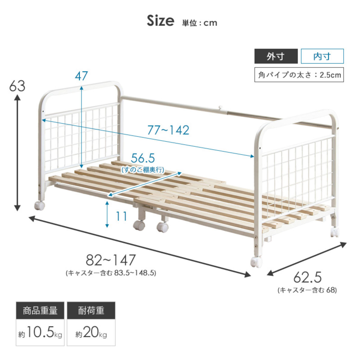 | サイズ | 本体:幅82-147cm(キャスター含む83.5-148.5cm)×奥行62.5cm(キャスター含む68cm)×高さ63cm |