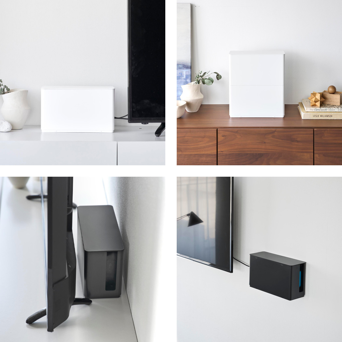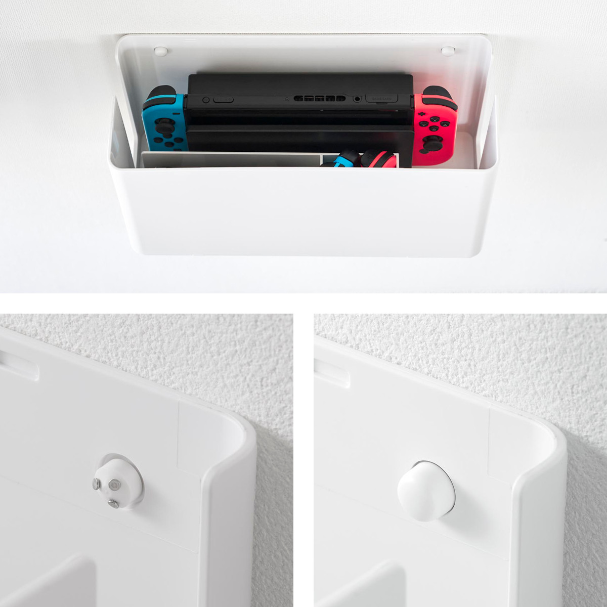 壁の穴が目立ちにくい石こうボードピンで簡単に壁へ取り付けできます。蓋付きなのでホコリを防ぎ、浮かせて収納できるので掃除もラクラク。