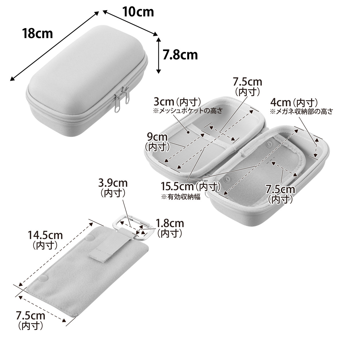 | サイズ | 約 幅18×奥行10×高さ7.8(cm) ソフトケース:約 幅7.5×高さ14.5(cm) 【内寸】 メガネ収納部:約 幅15.5×奥行7.5×高さ4(cm) メッシュポケット:約 幅9×奥行7.5×高さ3(cm) 有効収納幅:約 幅15.5(cm) |