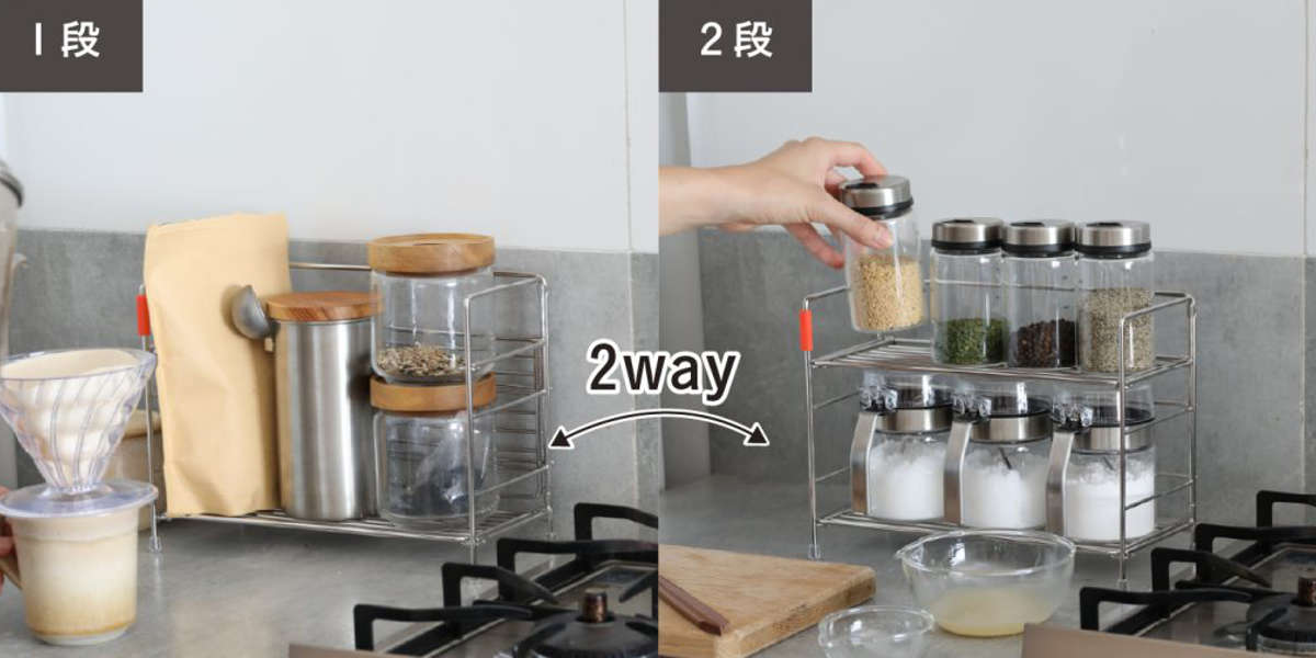 使う場所や置くものに合わせて高さを選べる、2way設計です。1段でも2段でも使えるので、調味料の高さやキッチンの空きスペースに応じて、自由にレイアウトできます。