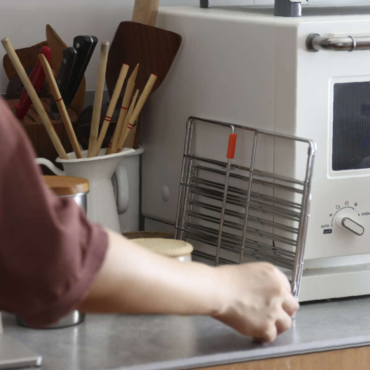 使わないときはすっきりと収納でき、必要なときにサッと取り出せます。薄く折りたためるので、キッチンの棚や引き出しにもスムーズに収まり、出し入れもラクラクです。
