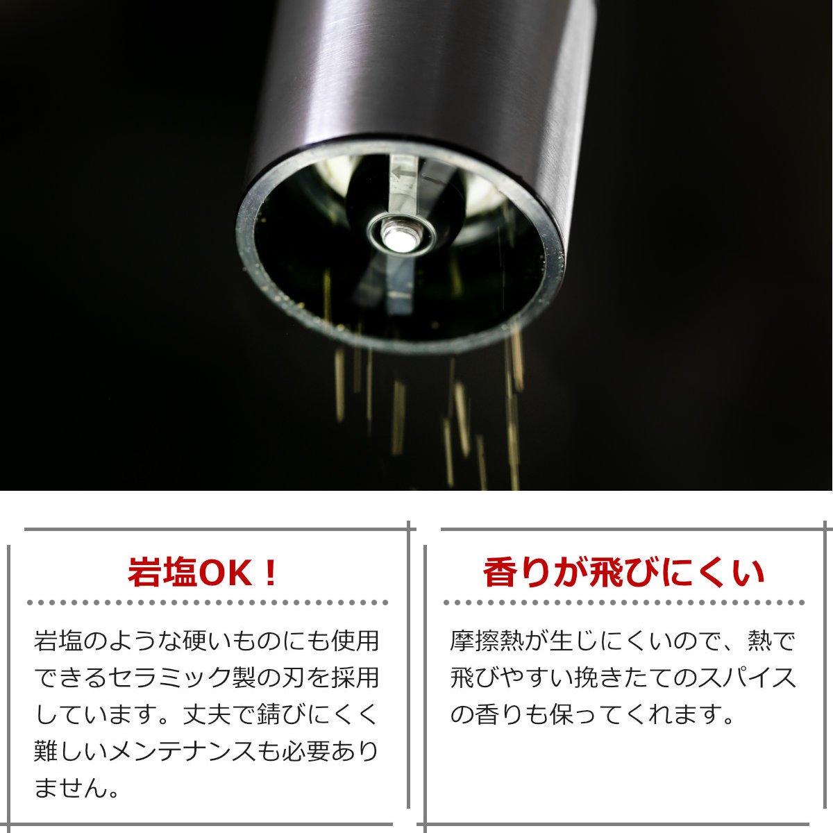 サビの心配がなく、岩塩にも使用できる丈夫なセラミック製の刃を使用しています。摩擦熱が生じにくい材質のため、熱で飛びやすい胡椒の香りを保ちます。