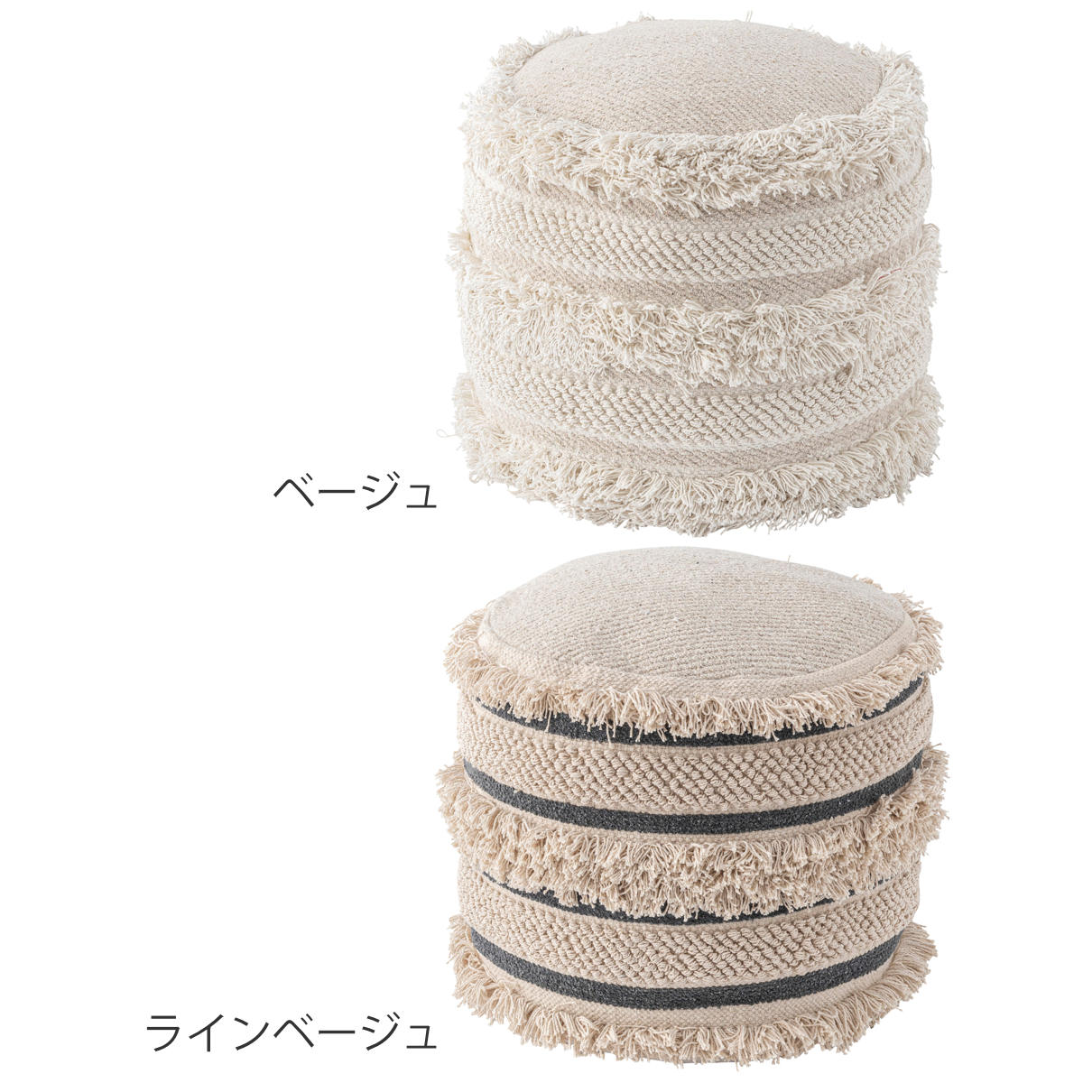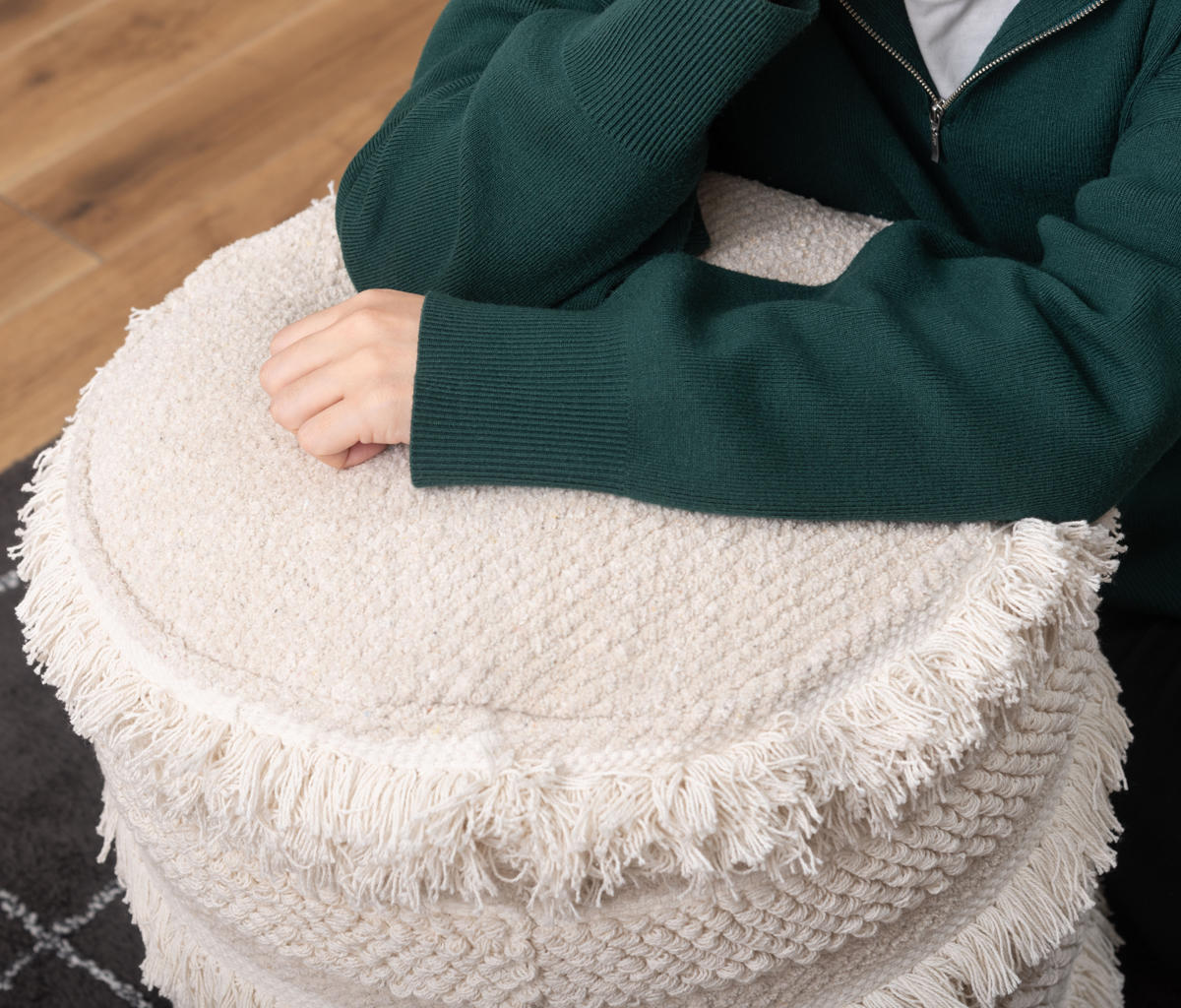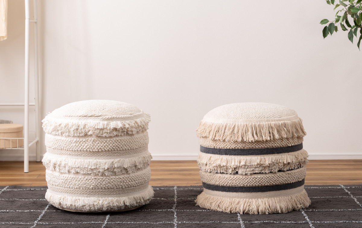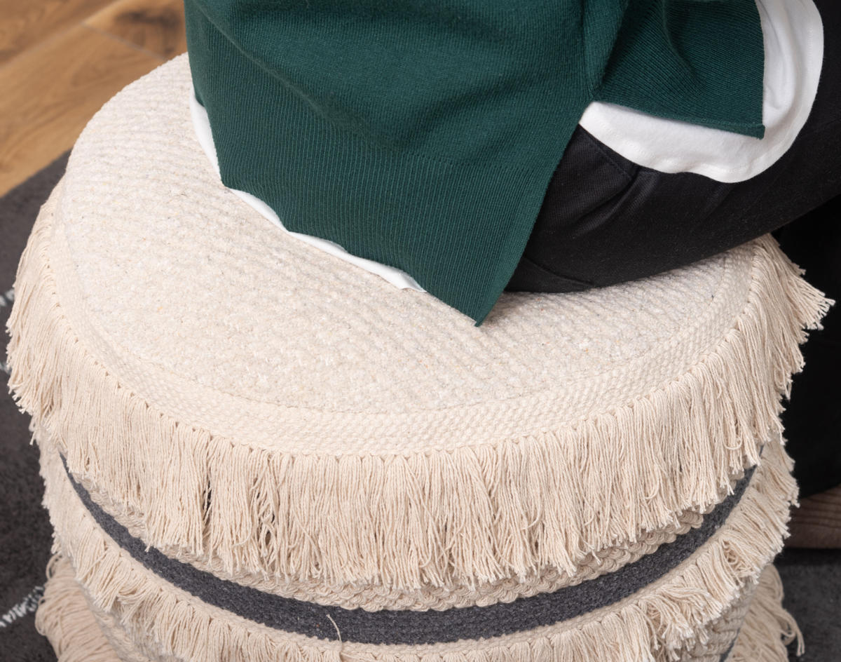 太い糸で織られたコットン生地に、フリンジや凹凸のある編み模様を組み合わせた立体的なデザインのスツールです。丸いフォルムとふんわりとした質感が、空間にやさしい雰囲気をつくります。