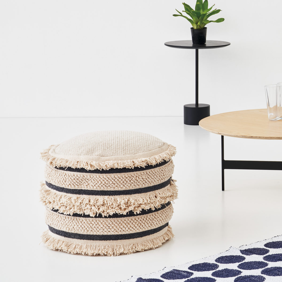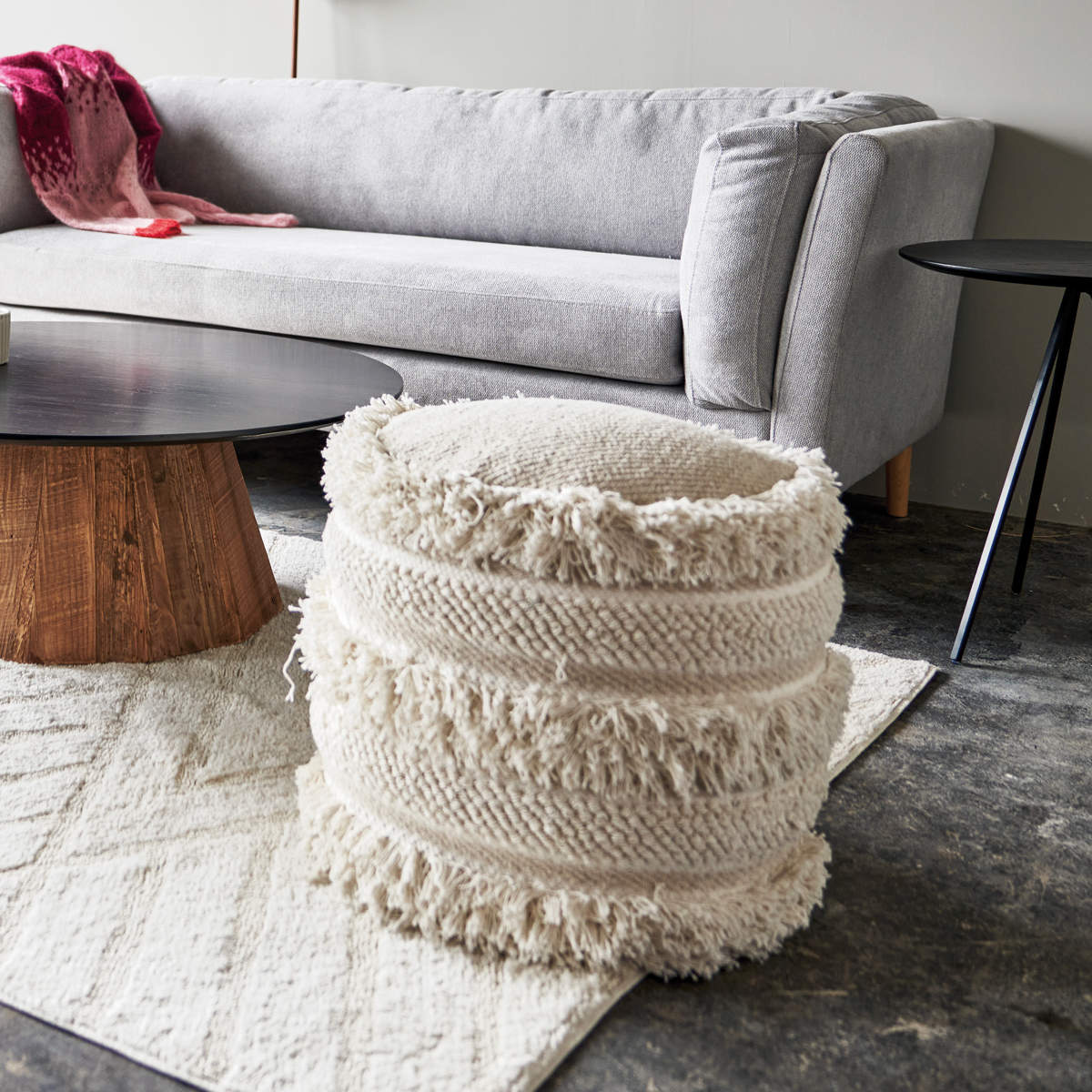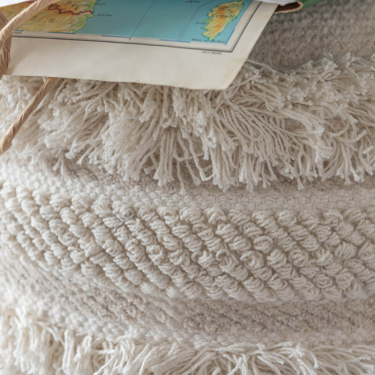 太い糸で織られたコットン生地に、フリンジや凹凸のある編み模様を組み合わせた立体的なデザインのスツールです。丸いフォルムとふんわりとした質感が、空間にやさしい雰囲気をつくります。