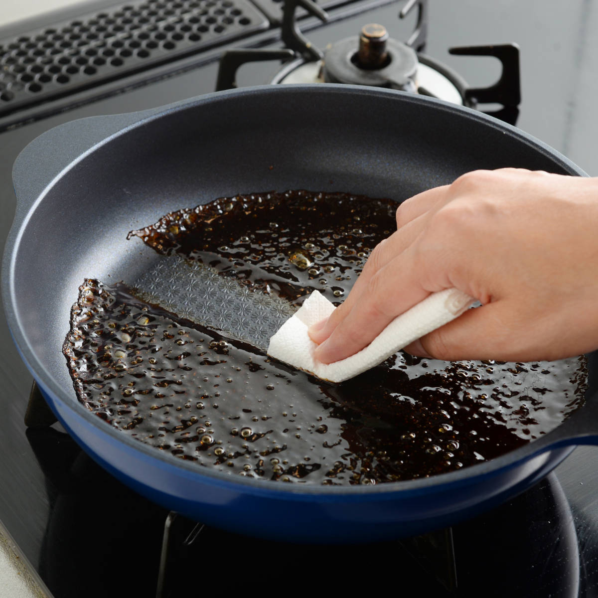 特殊4層コーティングは、耐摩耗試験100万回をクリアした高い耐久性を誇ります。焦げ付きやすいソースも、スルッと弾いて調理でき、こびりつきにくいためお手入れも簡単です。