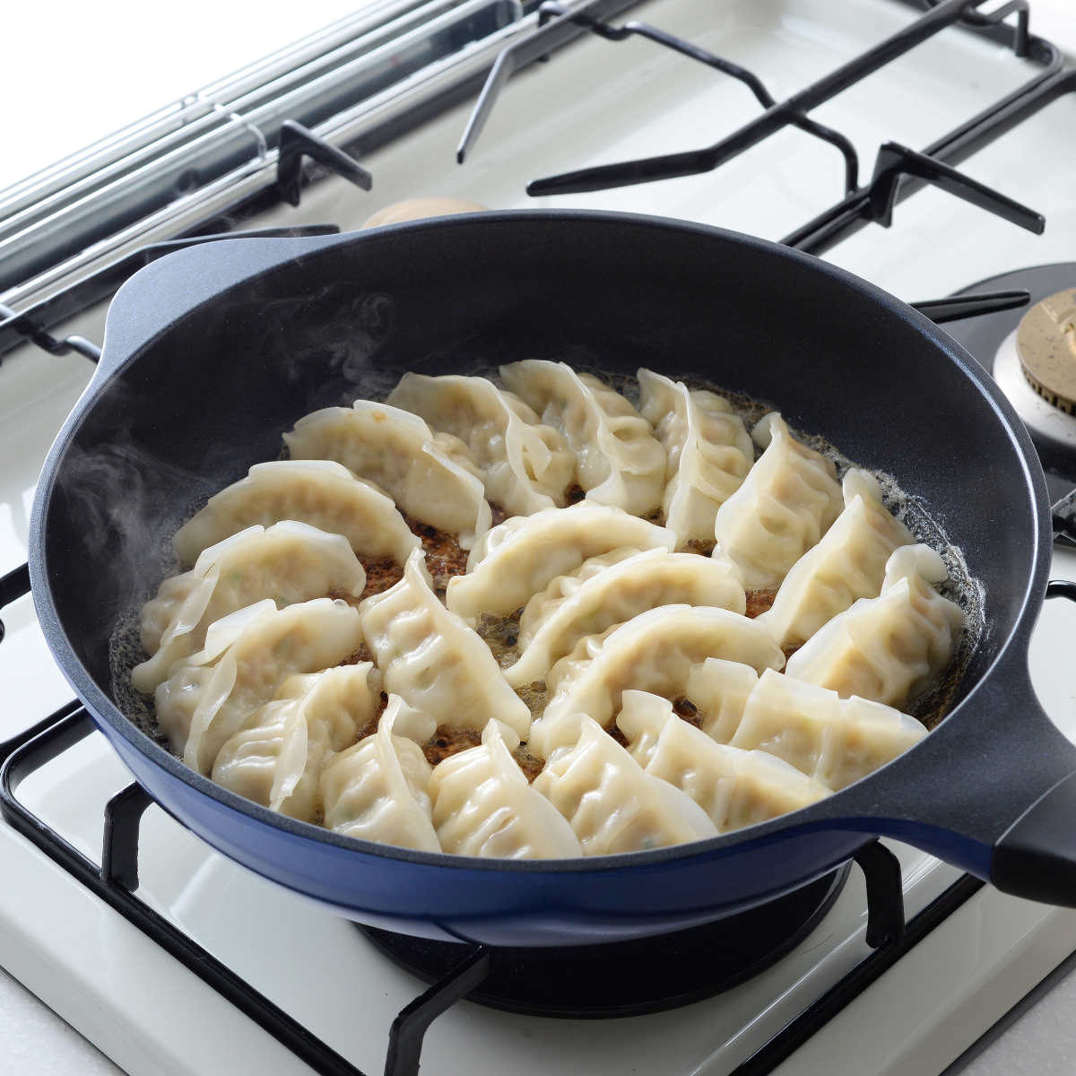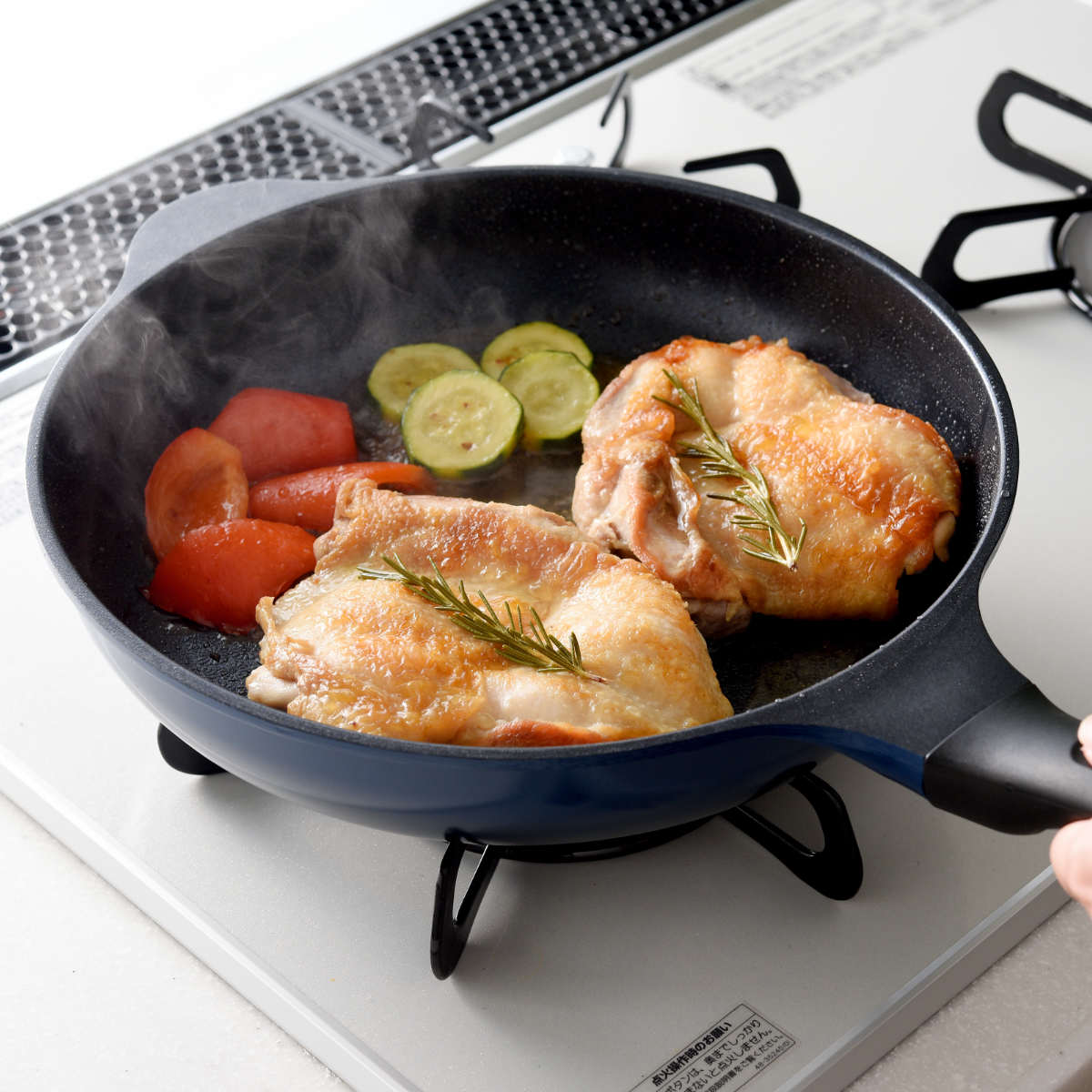 2~4人分の調理にちょうど良い26cmです。軽量設計で手首の負担を軽減し、サッと使える手軽さが魅力です。底面はしっかりと肉厚を持たせて熱を均一に伝えつつ、側面の余分な厚みを抑えることで、軽さと使いやすさを両立しています。